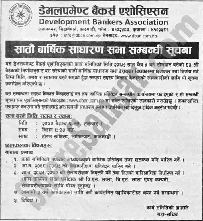 Development Bankers Association has announced its 7th AGM going to be held on 6th Baishak, 2070.