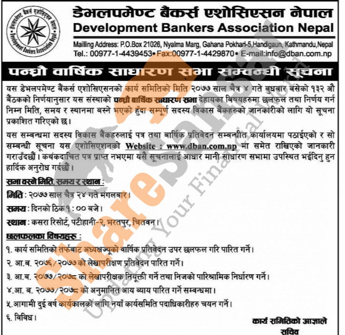 Development Bankers Association Nepal has announced its 15th AGM going to be held on 24th Chaitra, 2077.