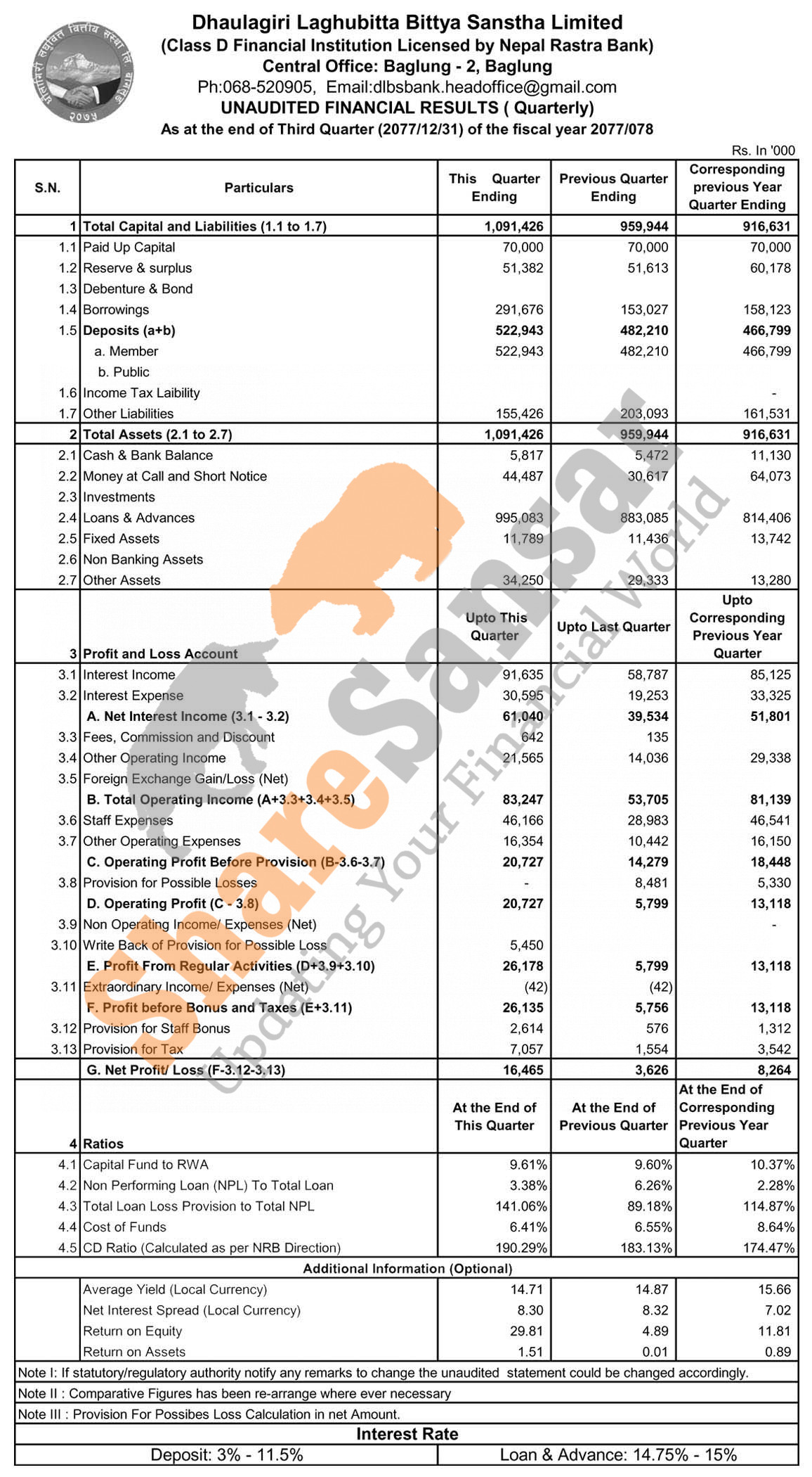 Dhaulagiri Laghubitta Bittiya Sanstha Limited has posted a net profit of Rs 16.46 million during the 3rd quarter of the fiscal year 2077/78.