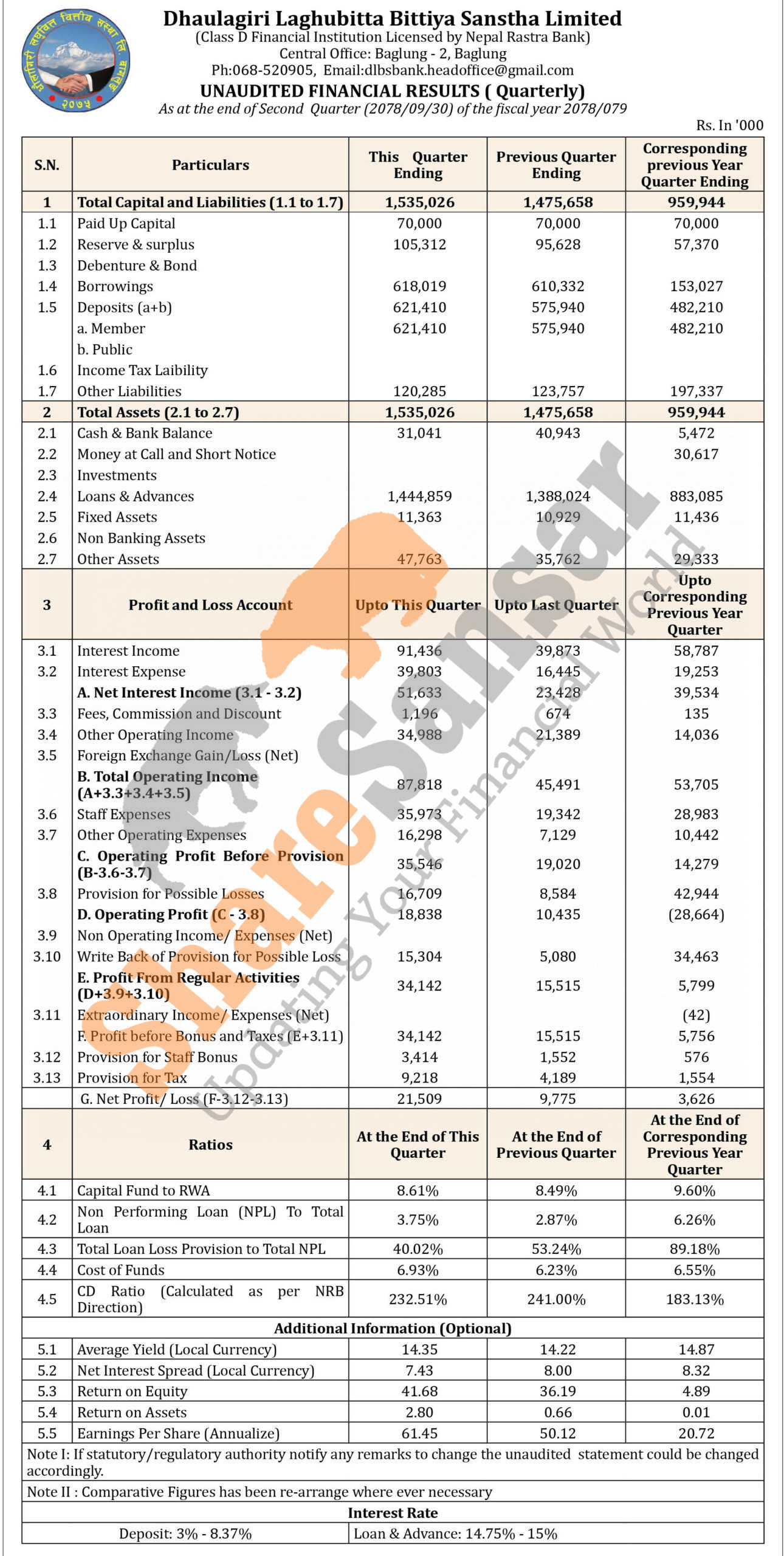 Dhaulagiri Laghubitta Bittiya Sanstha Limited has posted a net profit of Rs 21.50 million during the 2nd quarter of the fiscal year 2078/79.