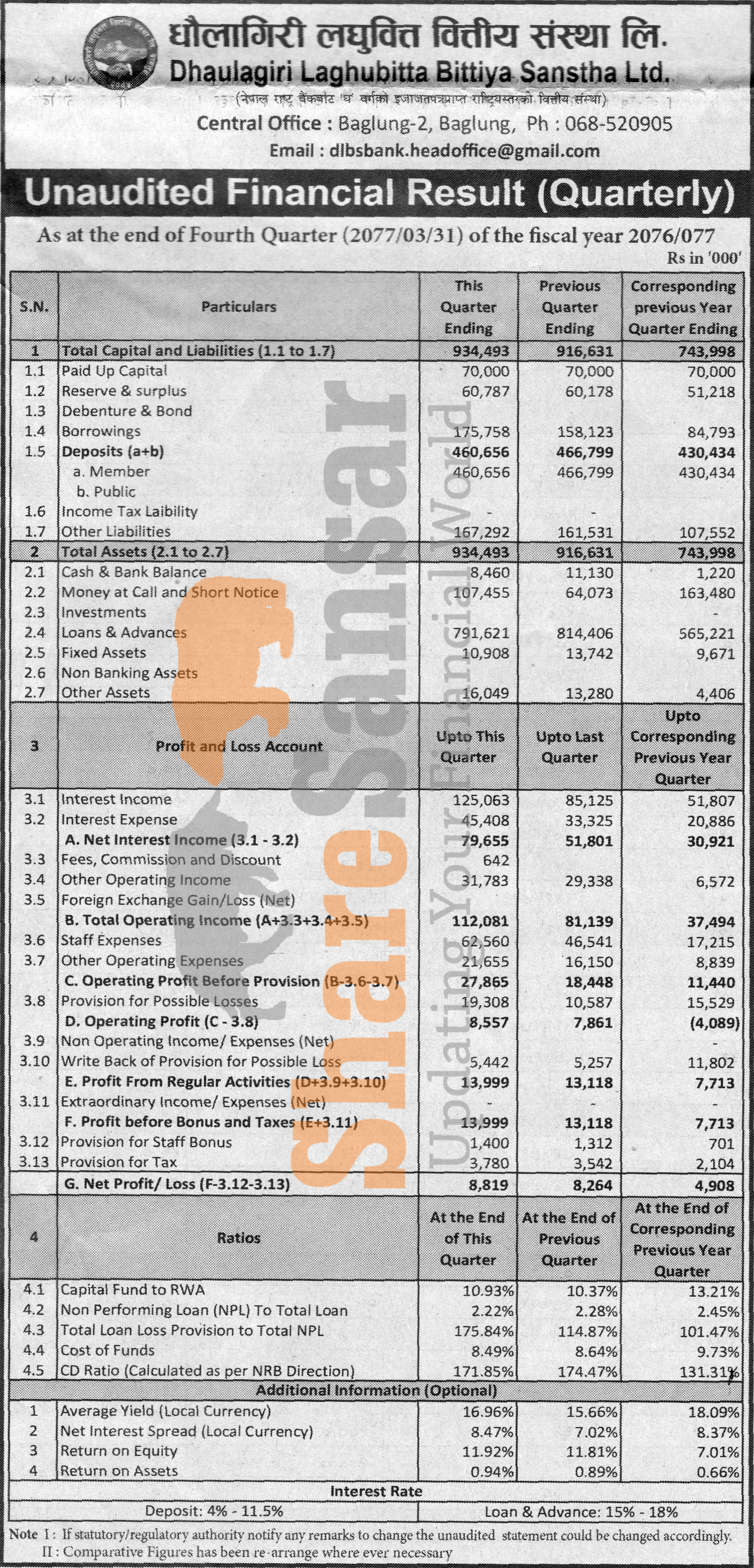 Dhaulagiri Laghubitta Bittiya Sanstha Limited has posted a net profit of Rs 8.81 million during the 4th quarter of the fiscal year 2076/77.