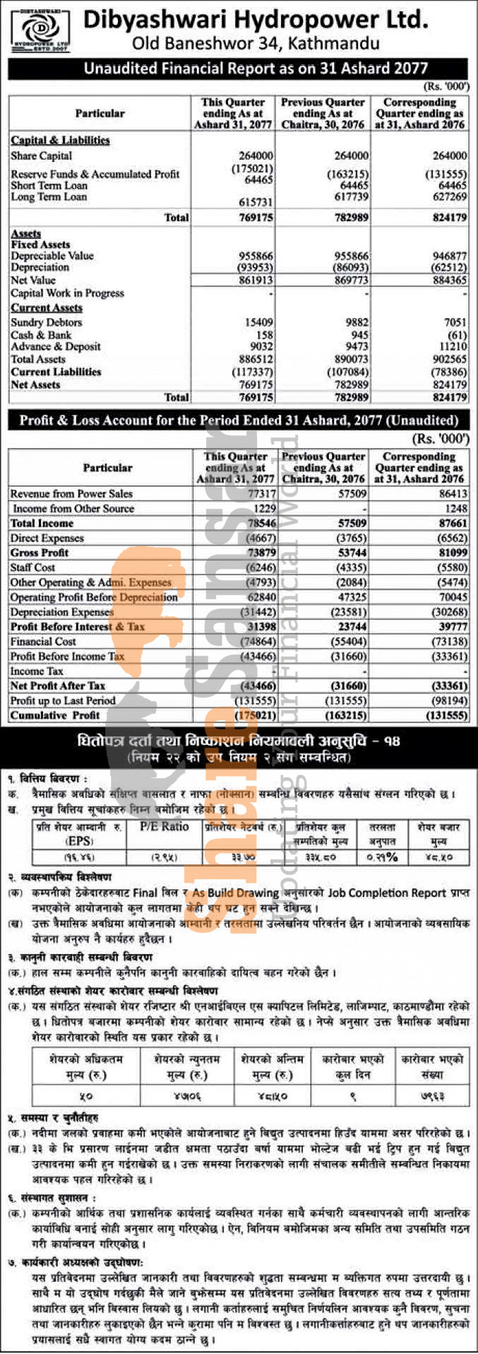 Dibyashowri Hydropower Company Limited has posted a net loss of Rs 43.46 million and published its 4th quarter company analysis of the fiscal year 2076/77.