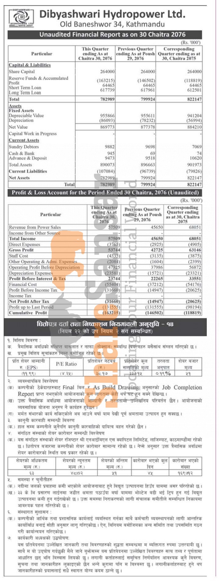 Dibyashwari Hydropower Company Limited has posted a net loss of Rs 31.66 million and published its 3rd quarter company analysis of the fiscal year 2076/77.