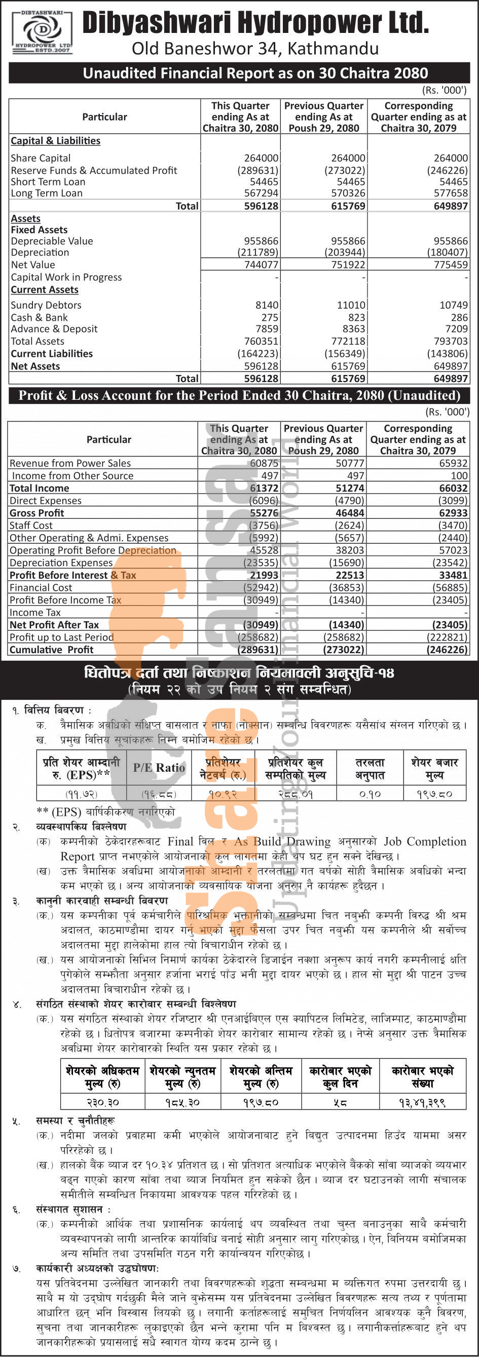 Dibyashwari Hydropower Limited has posted a net loss of Rs 30.94 million and published its 3rd quarter company analysis of the fiscal year 2080/81.