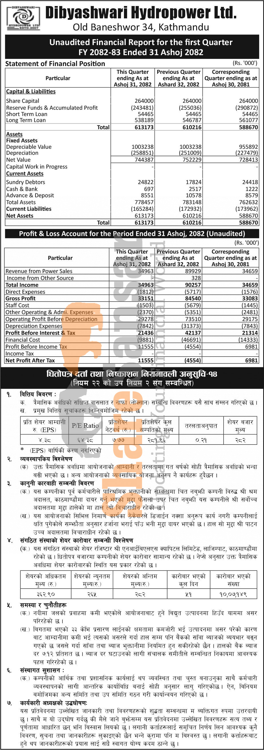 Dibyashwari Hydropower Limited has posted a net profit of Rs 11.55 million and published its 1st quarter company analysis of the fiscal year 2082/83.