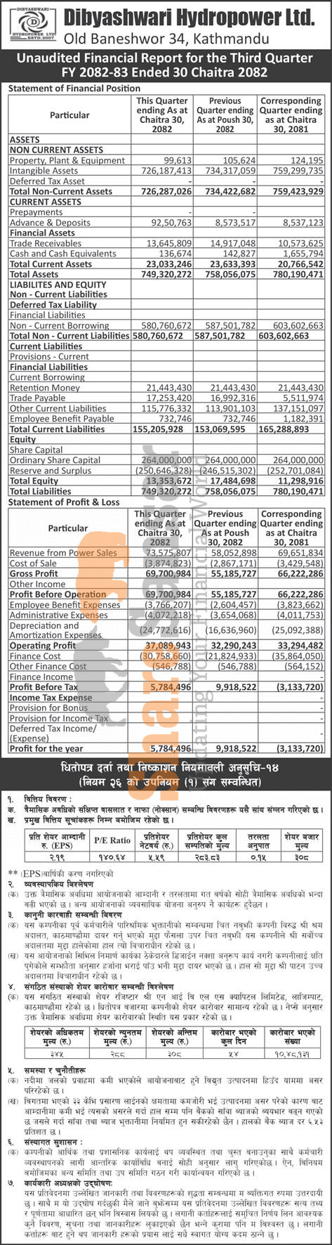 Dibyashwari Hydropower Limited has posted a net profit of Rs 5.78 million and published its 3rd quarter company analysis of the fiscal year 2082/83.