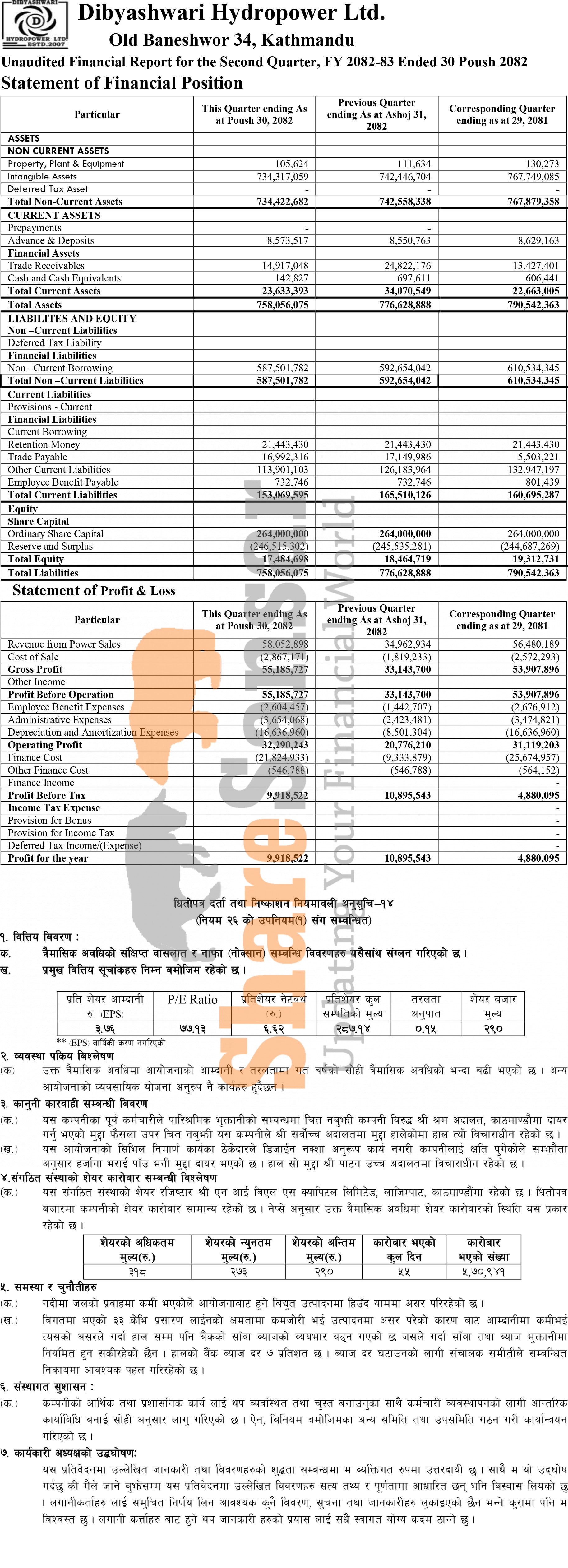 Dibyashwari Hydropower Limited has posted a net profit of Rs 9.91 million and published its 2nd quarter company analysis of the fiscal year 2082/83.