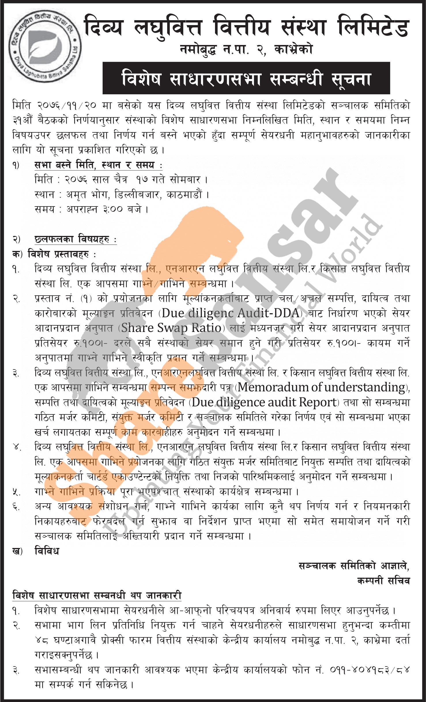 Divya Laghubitta Bittiya Sanstha Limited has announced its Special General Meeting going to be held on 17th Chaitra, 2076.