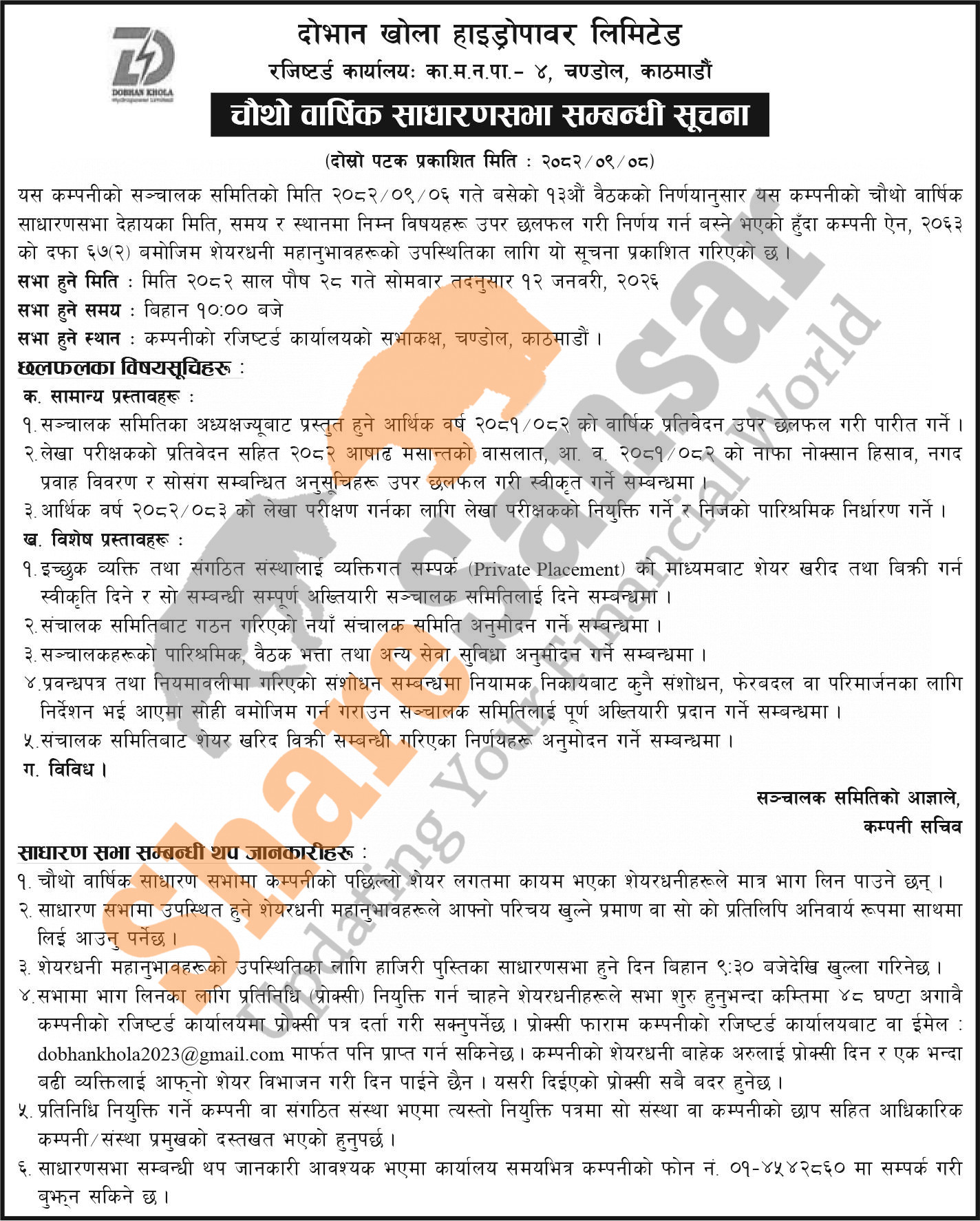 Dobhan Khola Hydropower Limited has announced its 4th AGM going to be held on 28th Poush, 2082.