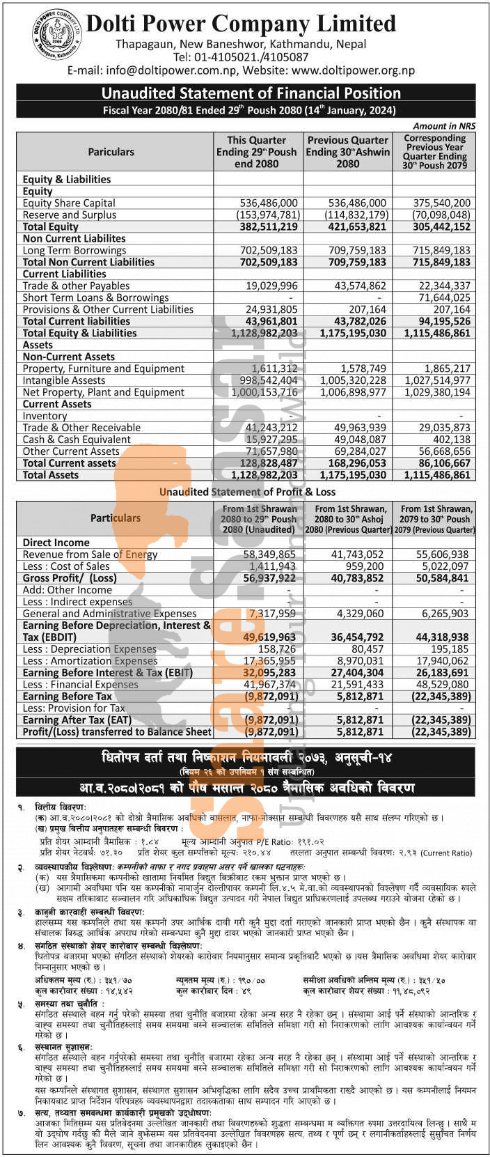 Dolti Power Company Limited has posted a net loss of Rs 9.87 million and published its 2nd quarter company analysis of the fiscal year 2080/81.