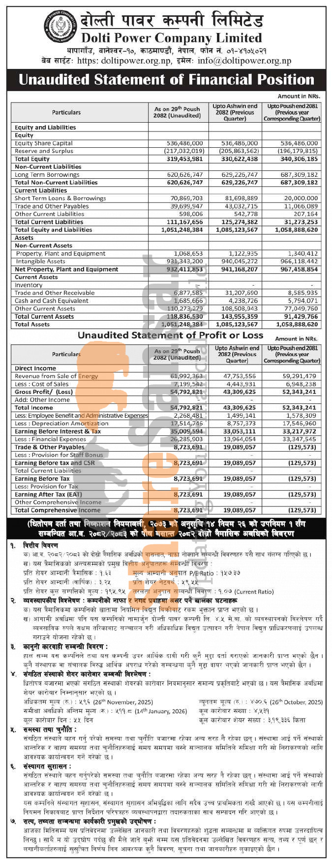Dolti Power Company Limited has posted a net profit of Rs 8.72 million and published its 2nd quarter company analysis of the fiscal year 2082/83.