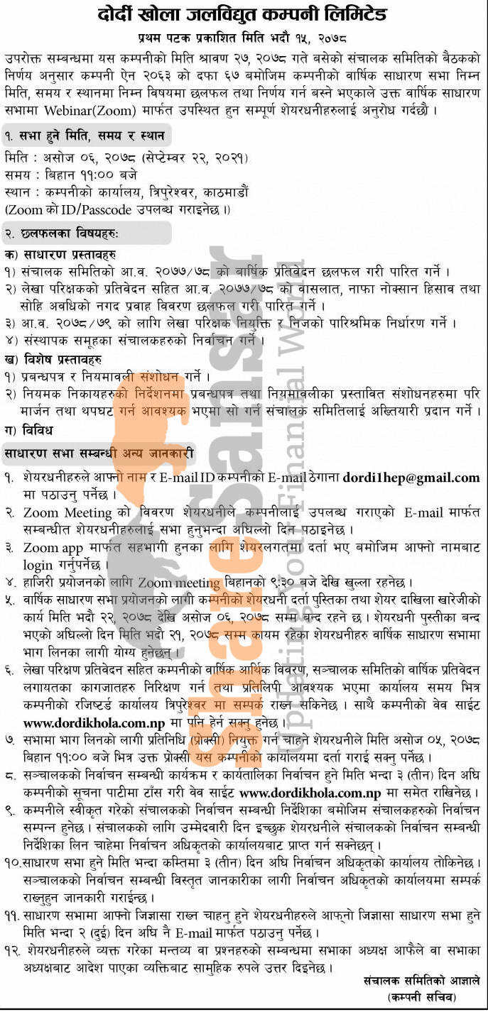 Dordi Khola Hydropower Company Limited has announced its AGM going to be held on 6th Ashwin, 2078.