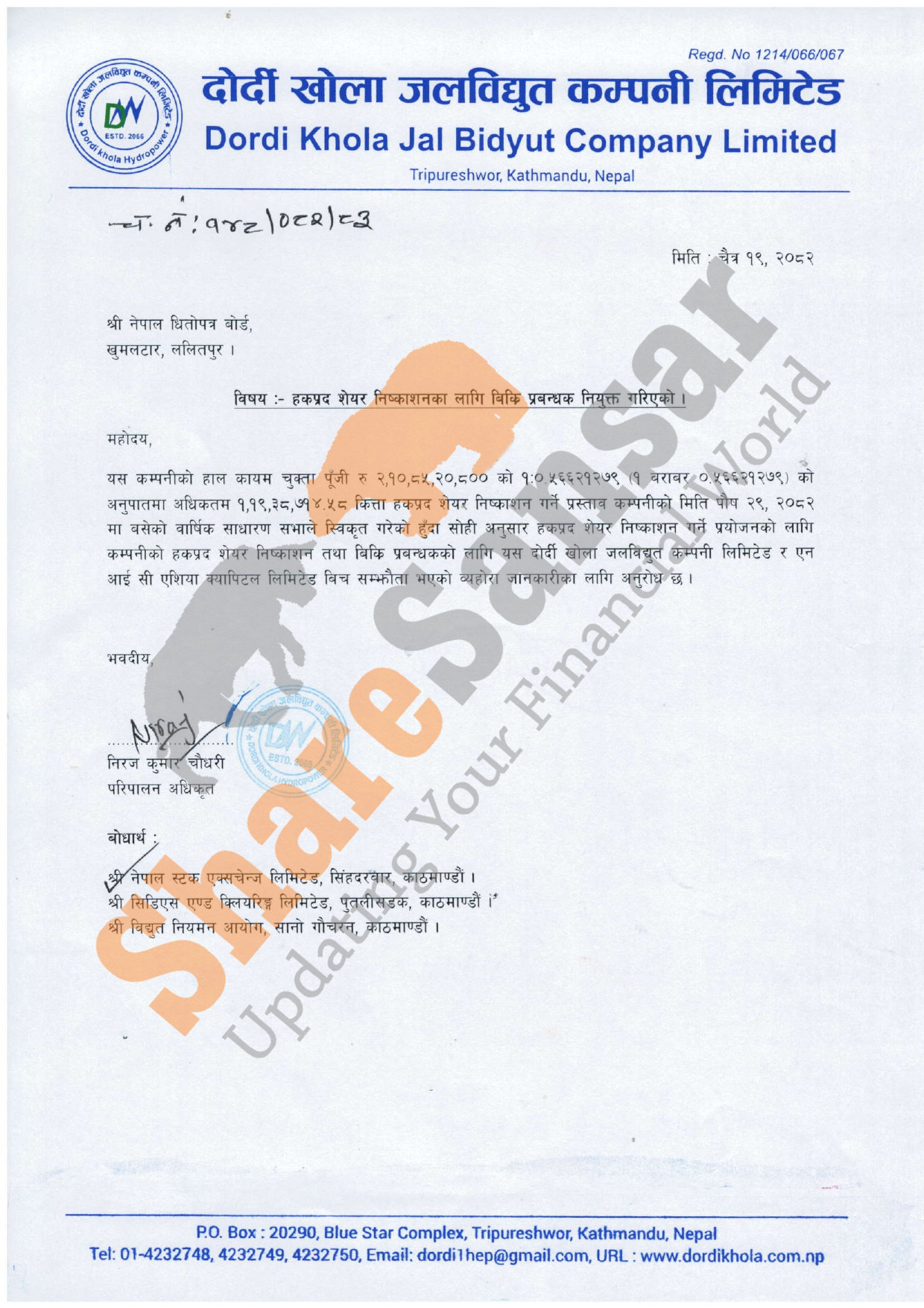Dordi Khola Hydropower Company Limited has appointed NIC Asia Capital Limited as its issue manager for its upcoming 1:0.56621279 ratio right share.