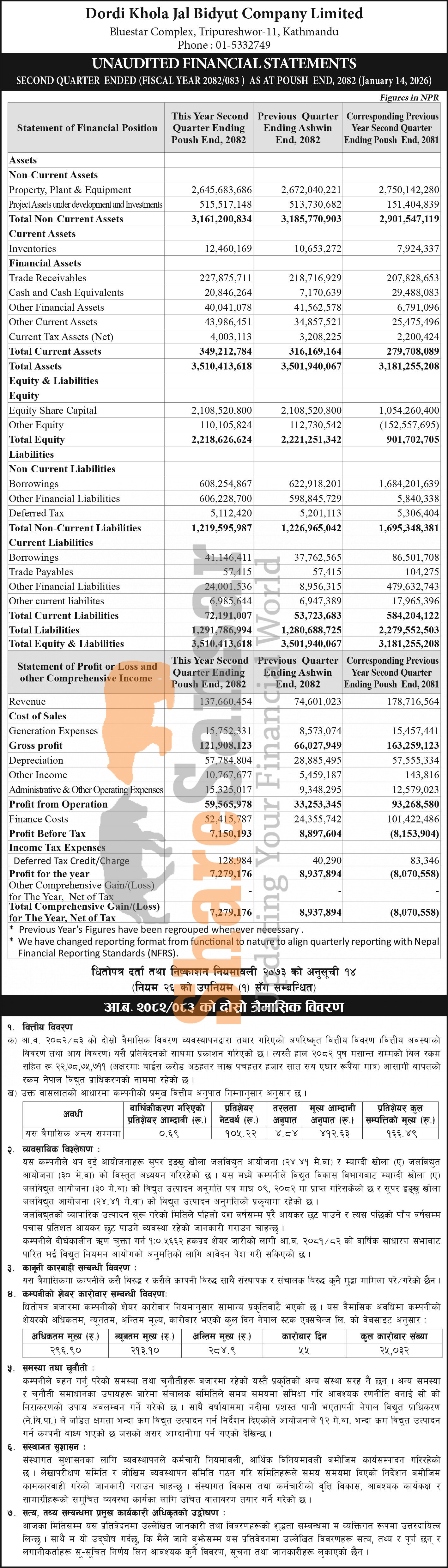 Dordi Khola Hydropower Company Limited has posted a net profit of Rs 7.27 million and published its 2nd quarter company analysis of the fiscal year 2082/83.