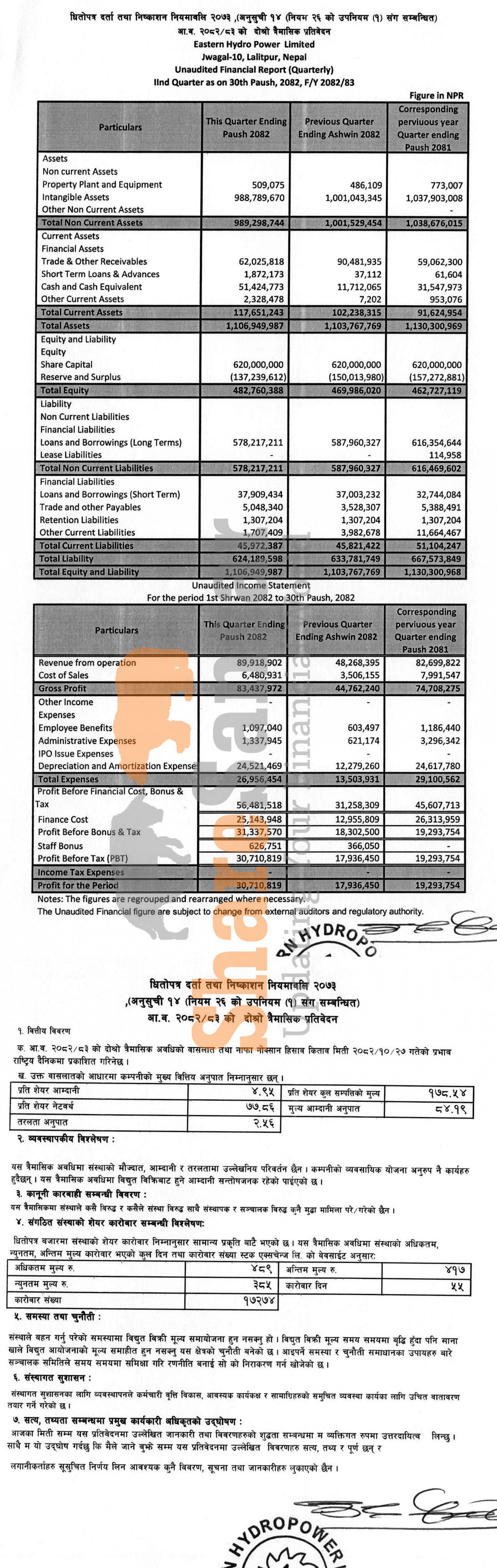 Eastern Hydropower Limited has posted a net profit of Rs 30.71 million and published its 2nd quarter company analysis of the fiscal year 2082/83.