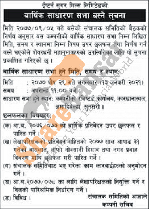 Eastern Sugar Mills Limited has announced its Annual General Meeting going to be held on 29th Poush, 2077.