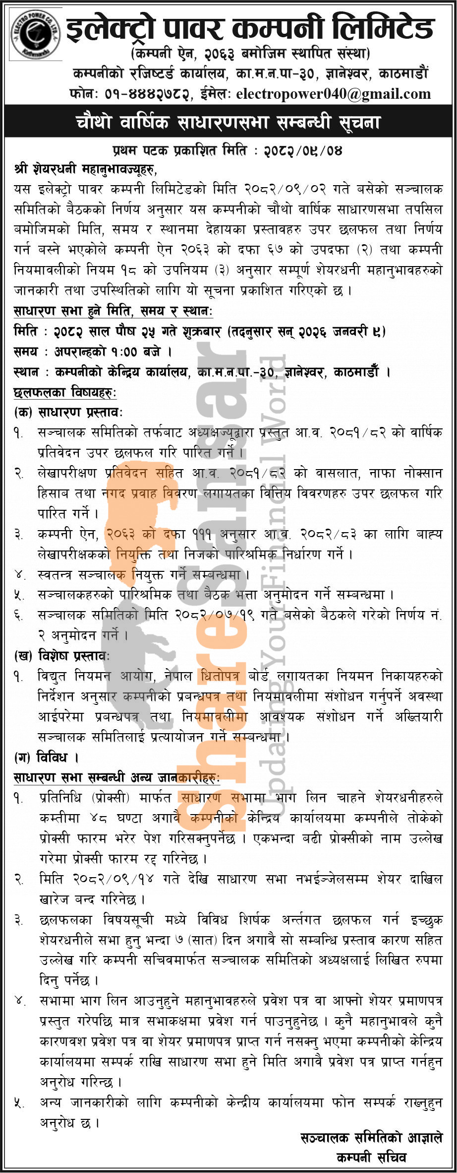 Electro Power Company Limited has announced its 4th AGM going to be held on 25th Poush, 2082.
