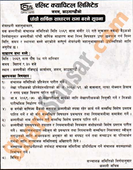 Elite Capital Limited has announced its 5th AGM going to be held on 28th Poush, 2069.