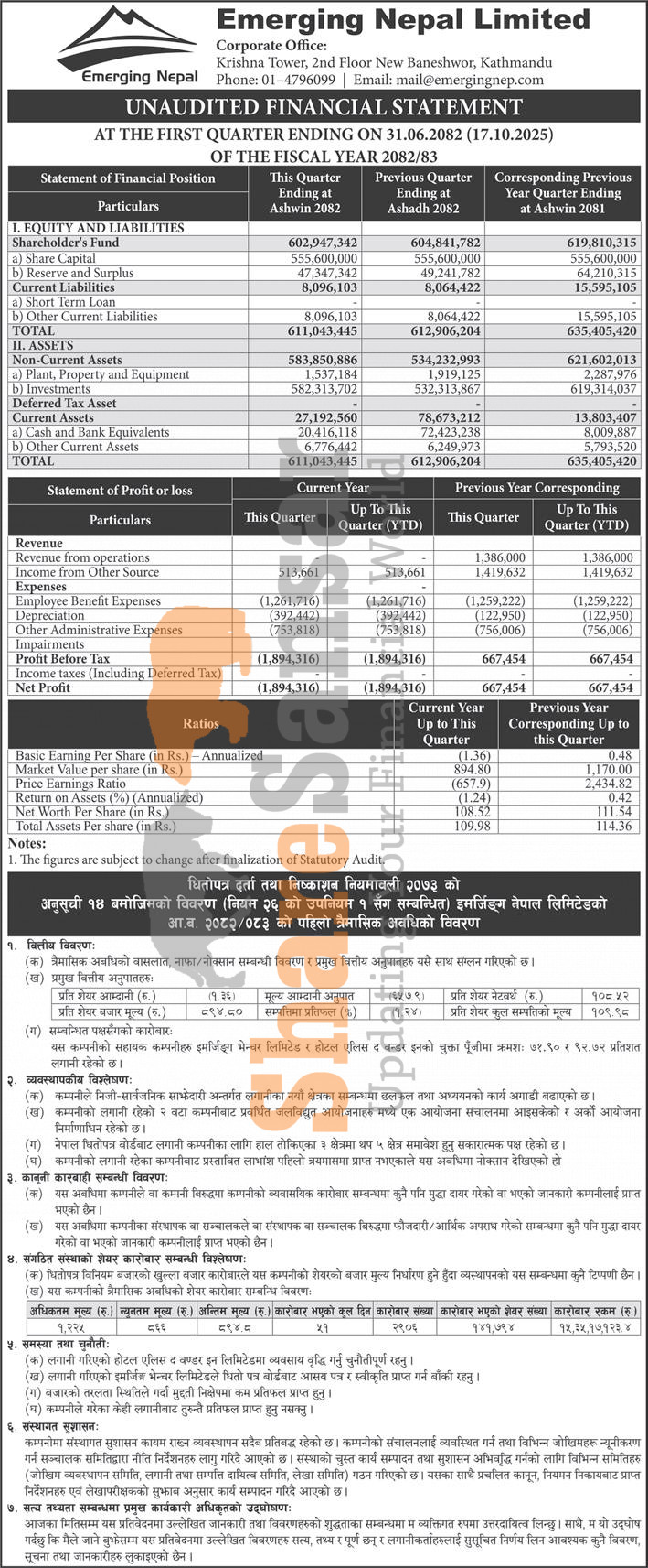 Emerging Nepal Limited has posted a net loss of Rs 1.89 million and published its 1st quarter company analysis of the fiscal year 2082/83.
