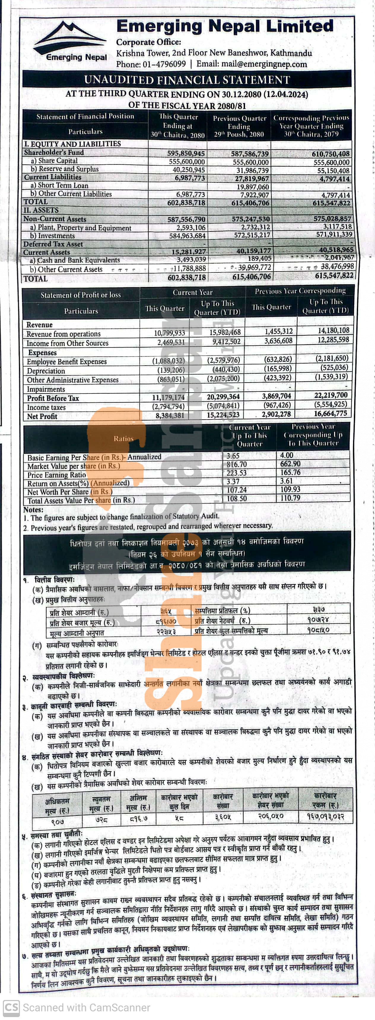 Emerging Nepal Limited has posted a net profit of Rs 15.22 million and published its 3rd quarter company analysis of the fiscal year 2080/81.