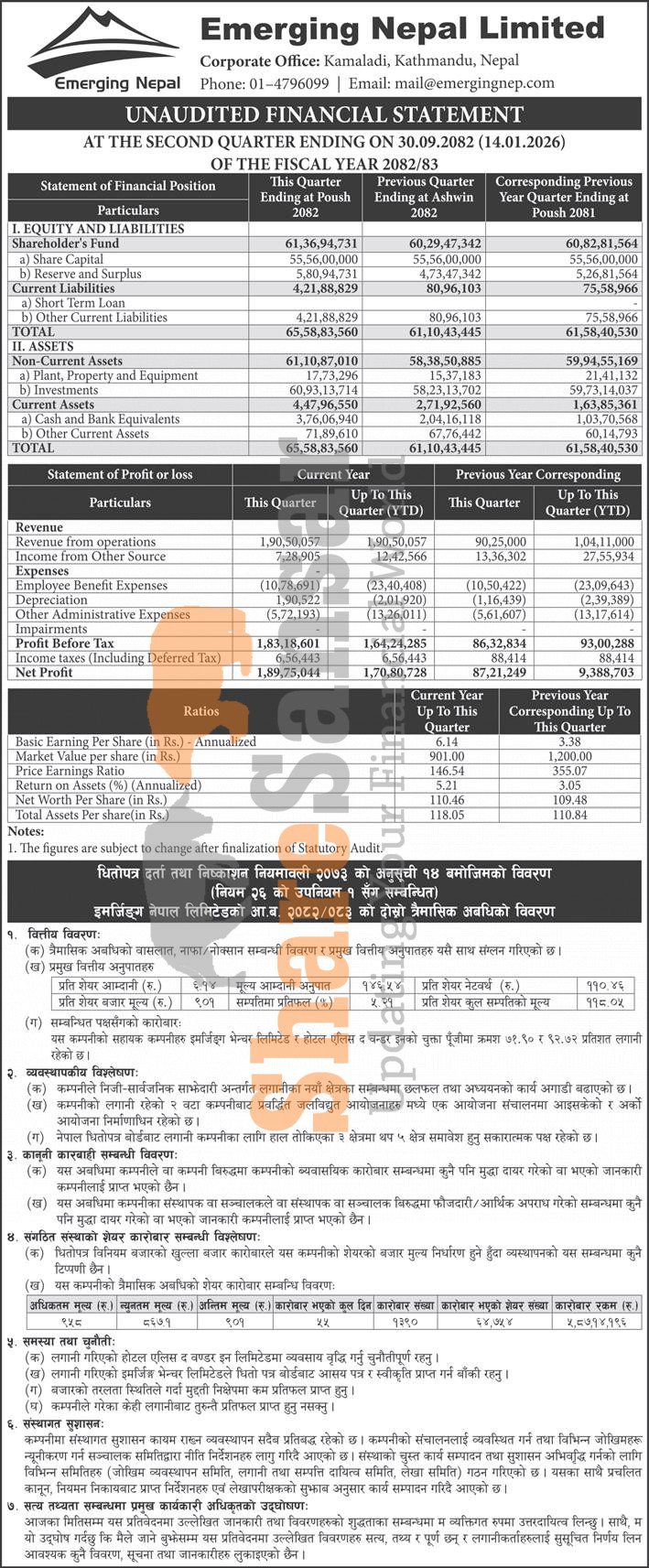 Emerging Nepal Limited has posted a net profit of Rs 17.08 million and published its 2nd quarter company analysis of the fiscal year 2082/83.