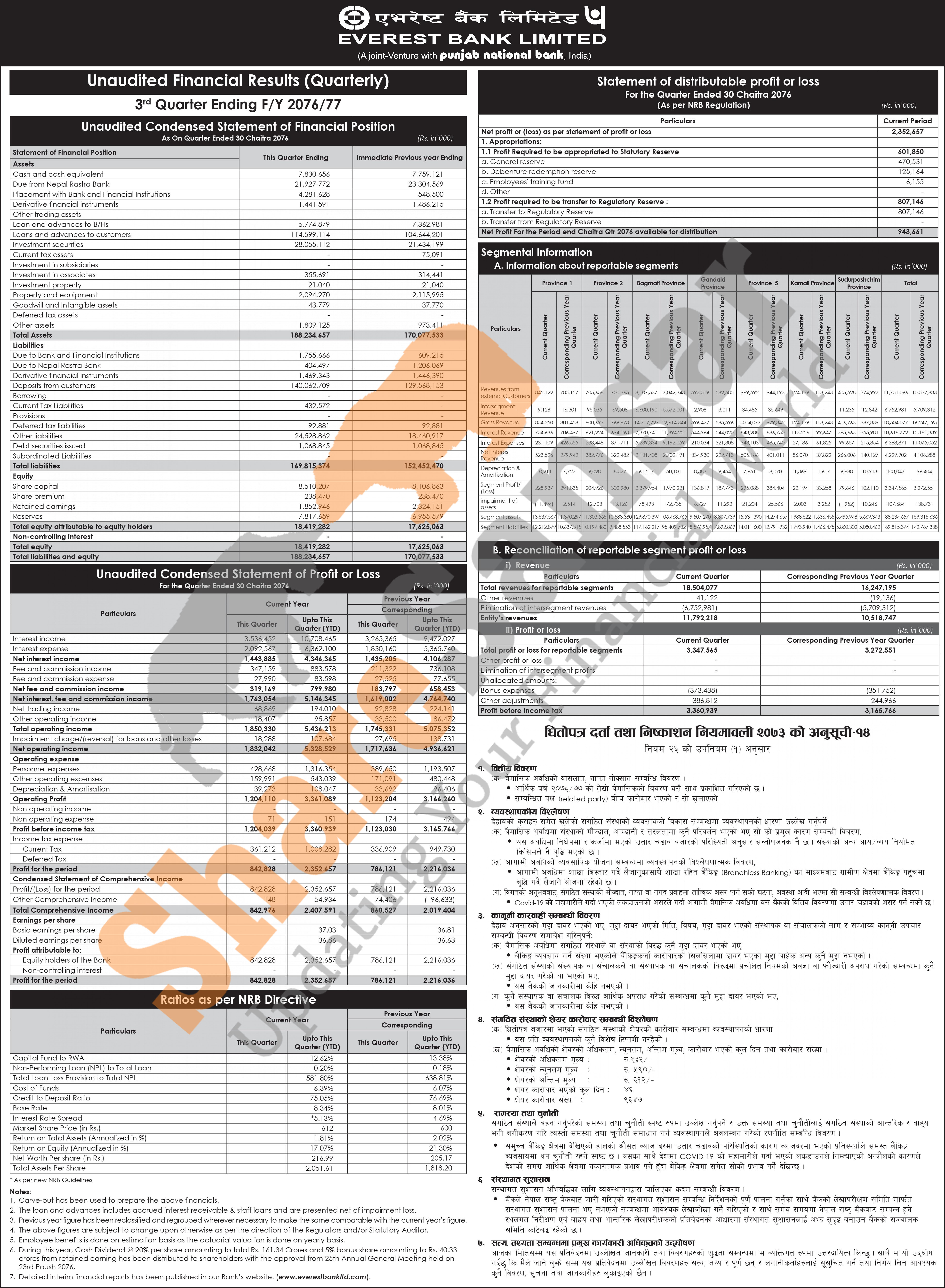 Everest Bank Limited has posted a net profit of Rs 2.35 billion and published its 3rd quarter company analysis of the fiscal year 2076/77.