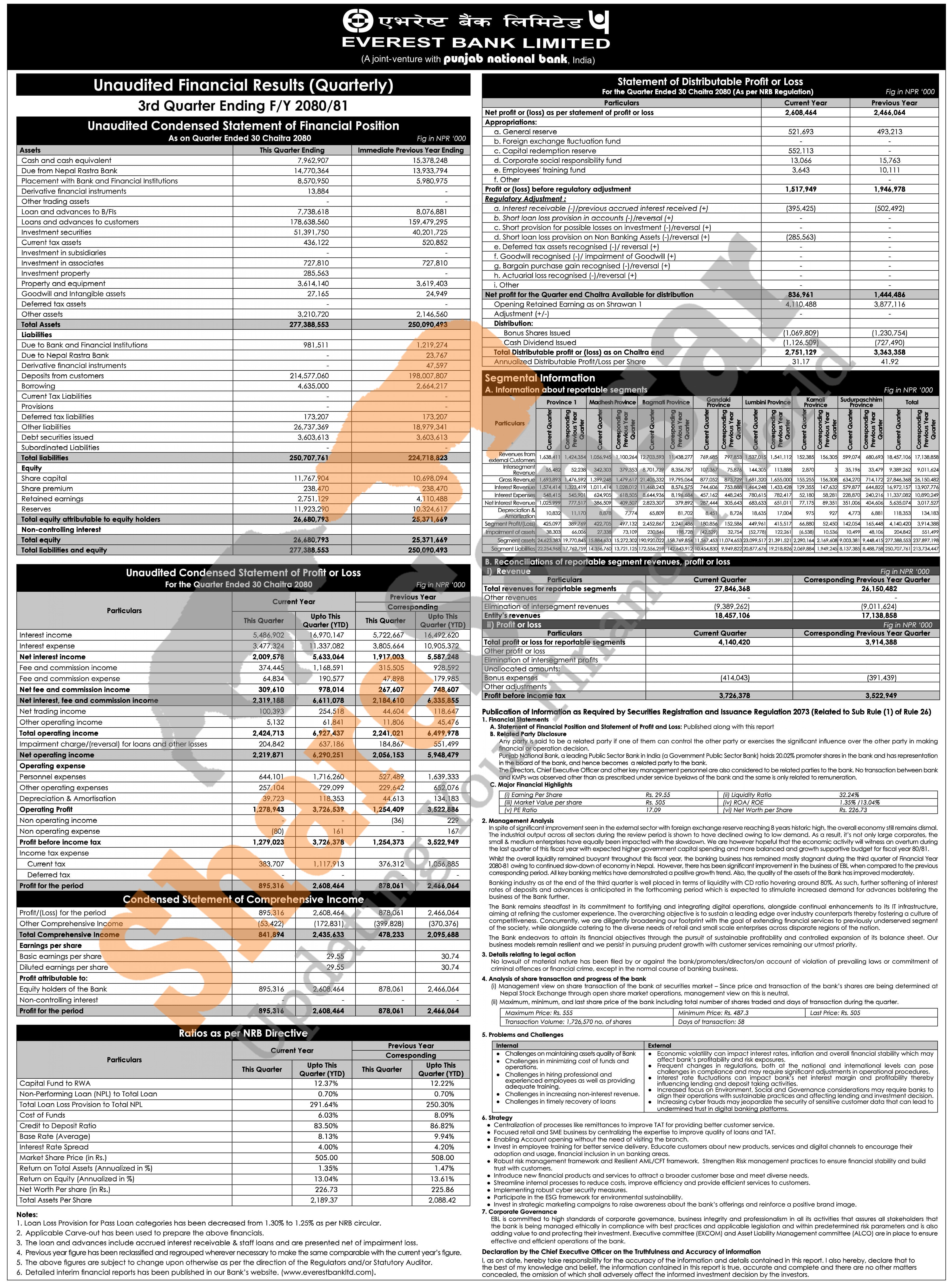 Everest Bank Limited has posted a net profit of Rs 2.60 billion and published its 3rd quarter company analysis of the fiscal year 2080/81.