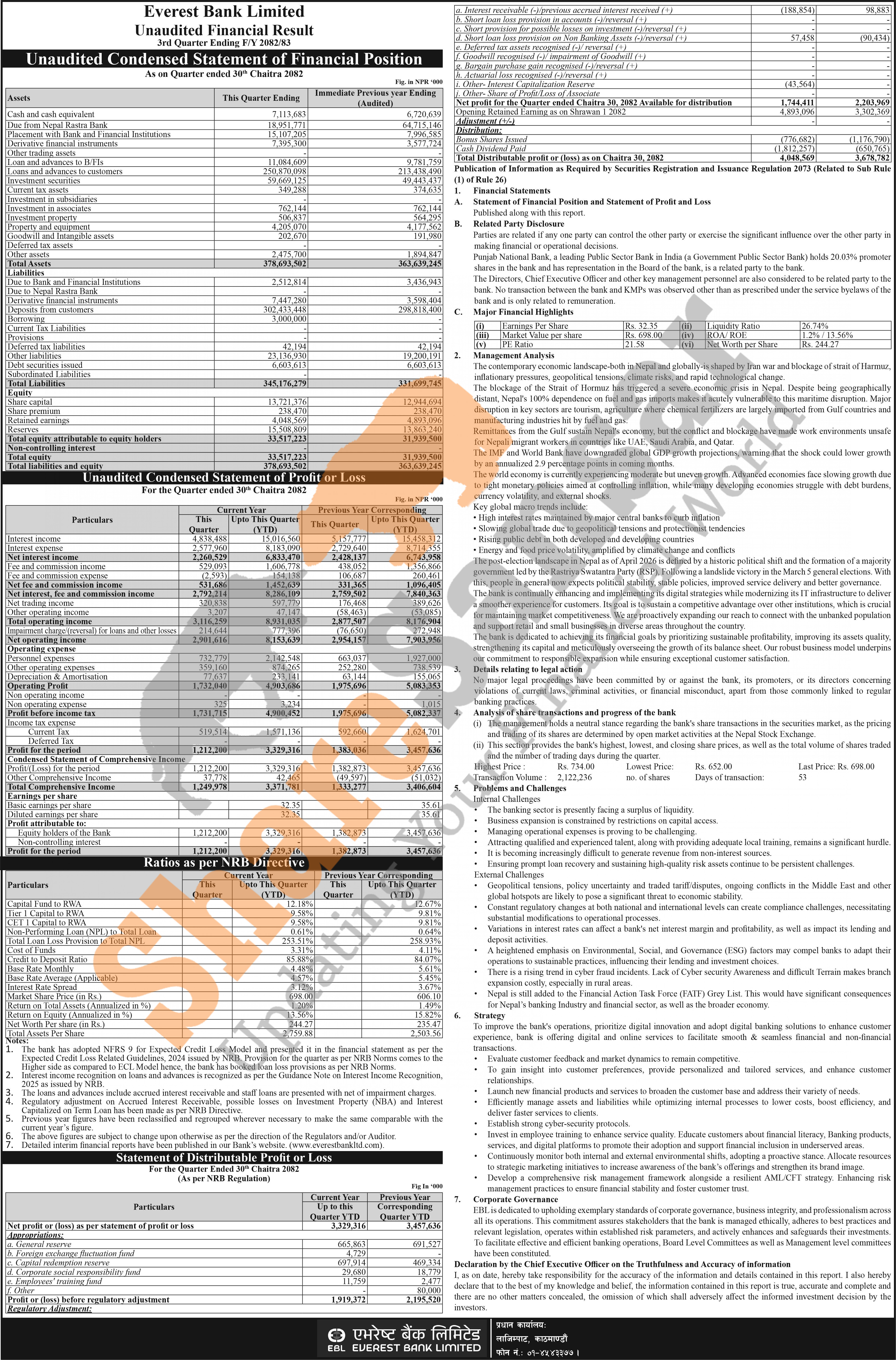 Everest Bank Limited has posted a net profit of Rs 3.32 billion and published its 3rd quarter company analysis of the fiscal year 2082/83.