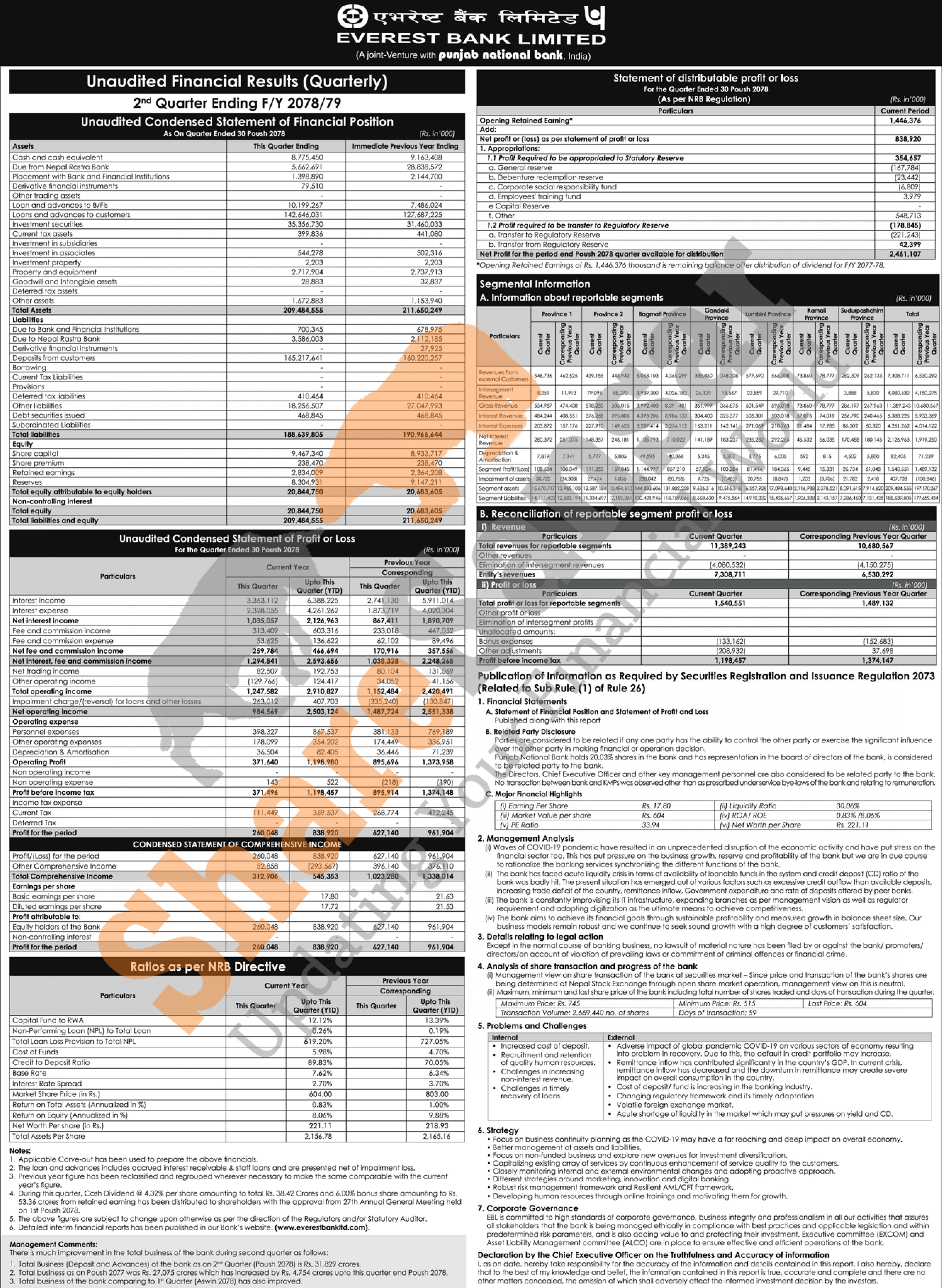 Everest Bank Limited has posted a net profit of Rs 838.92 million and published its 2nd quarter company analysis of the fiscal year 2078/79.