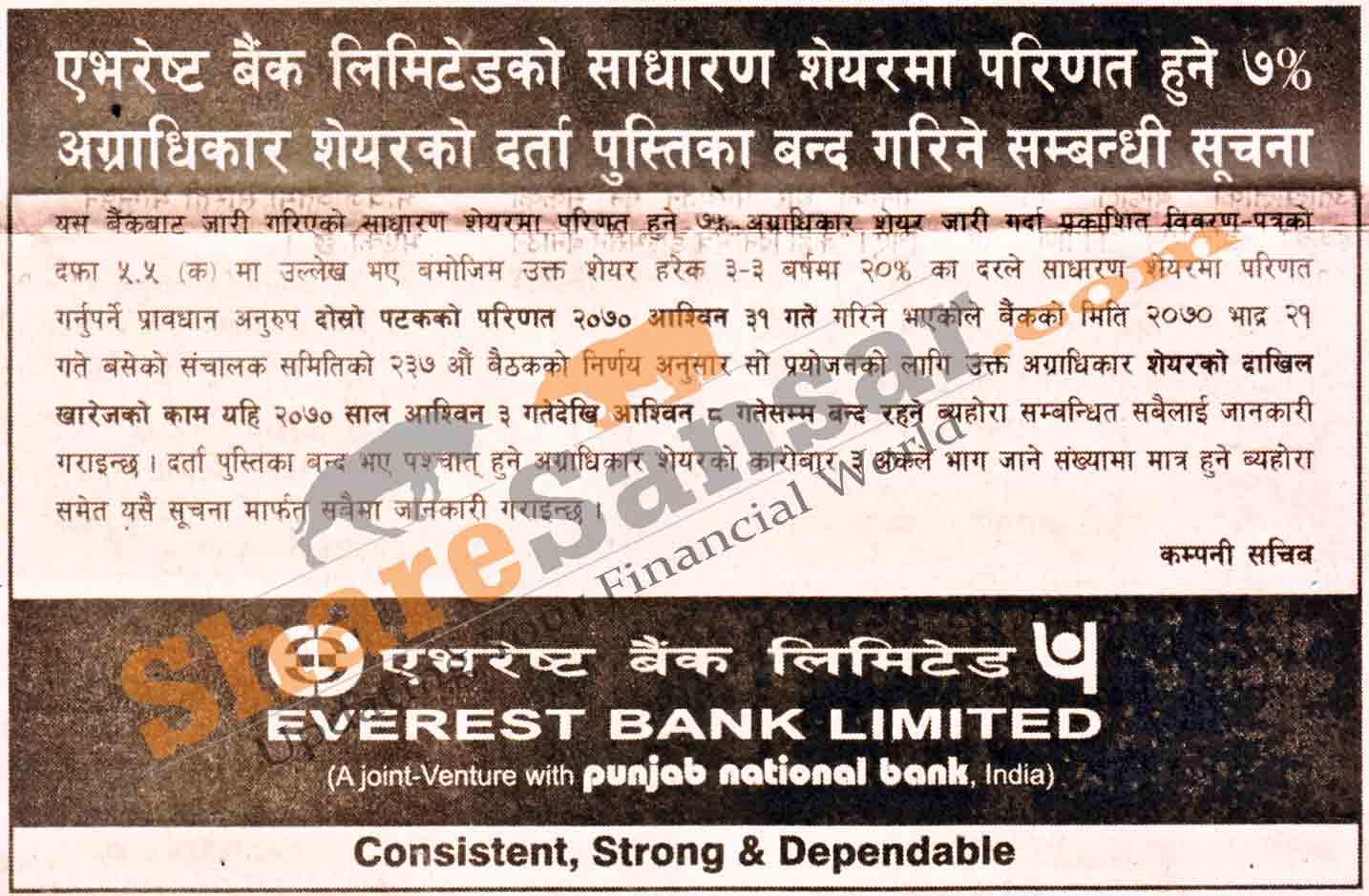 Everest Bank Limited has published a book closure date for the 20% conversion of 7% Convertible Preference Share to general share on 3rd Ashwin 2070.