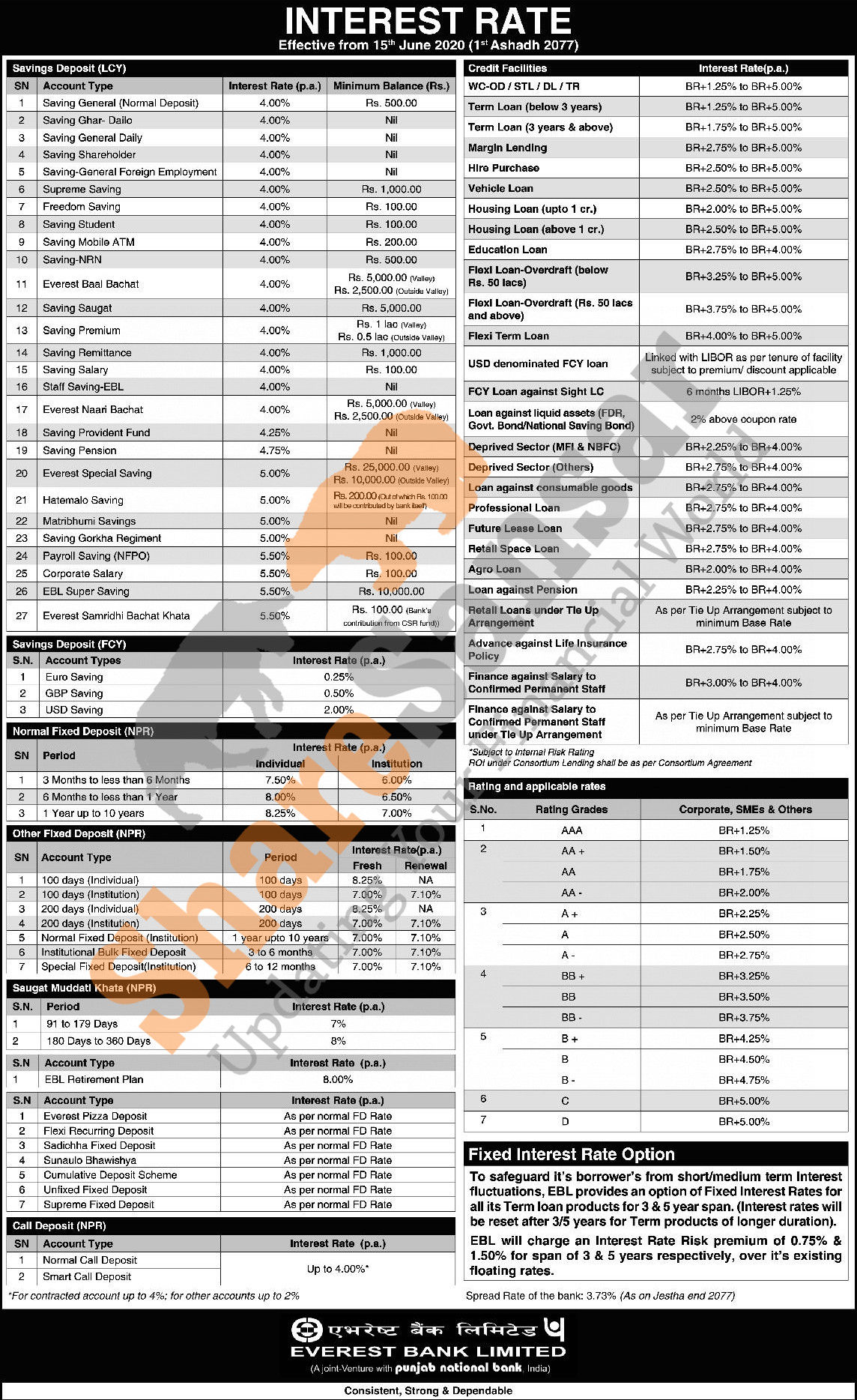Everest Bank Limited has published a notice regarding new interest rate and its effective from 10th Ashad, 2077.