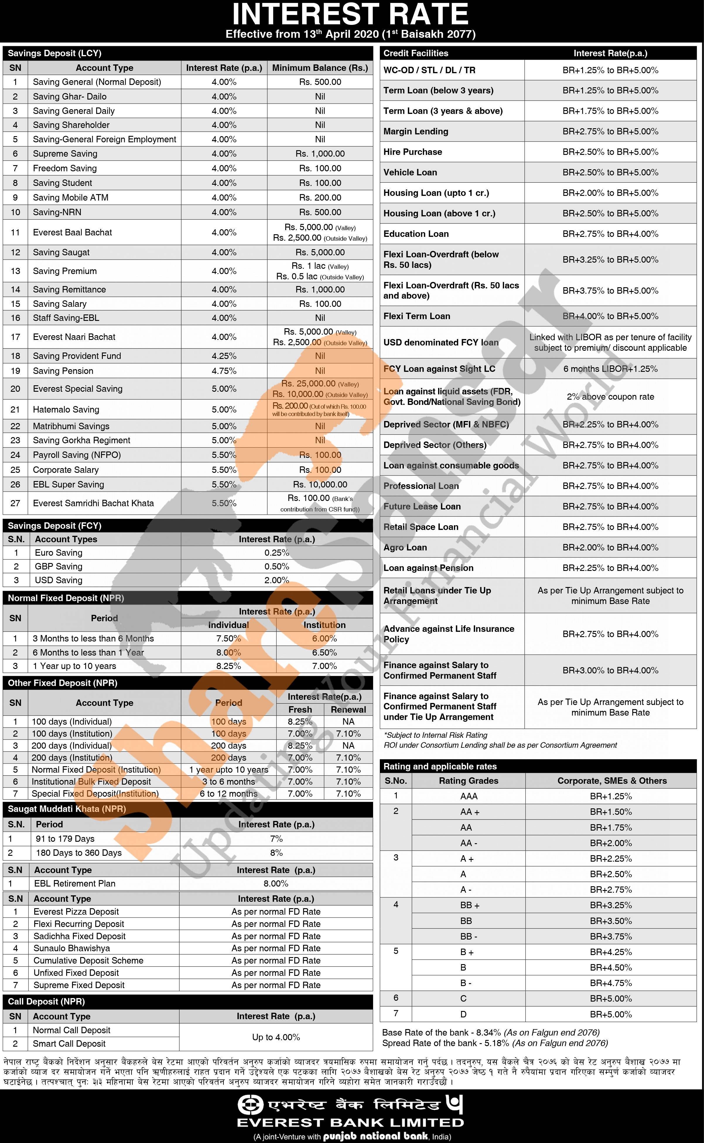 Everest Bank Limited has published a notice regarding new interest rate and its effective from 1st Baishakh, 2077.