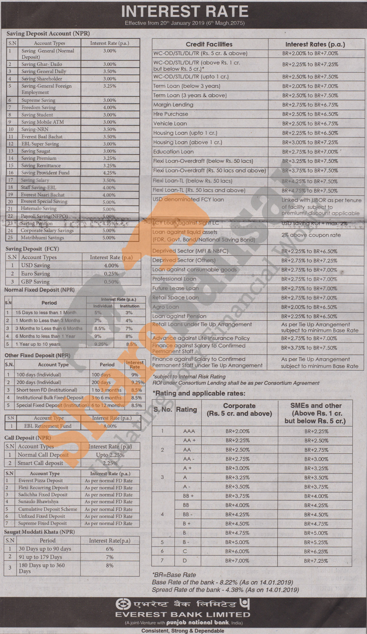 Everest Bank Limited has published a notice regarding new interest rate and its effective from 6th Magh, 2075.