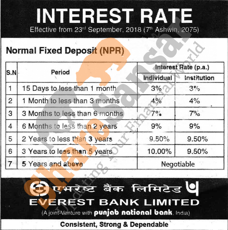 Everest Bank Limited has published a notice regarding new interest rate and its effective from 7th ashwin, 2075.