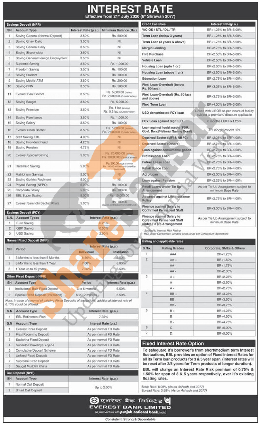 Everest Bank Limited has published a notice regarding the interest rate on the various deposit and loan products and its effective from 6th Shrawan, 2077.