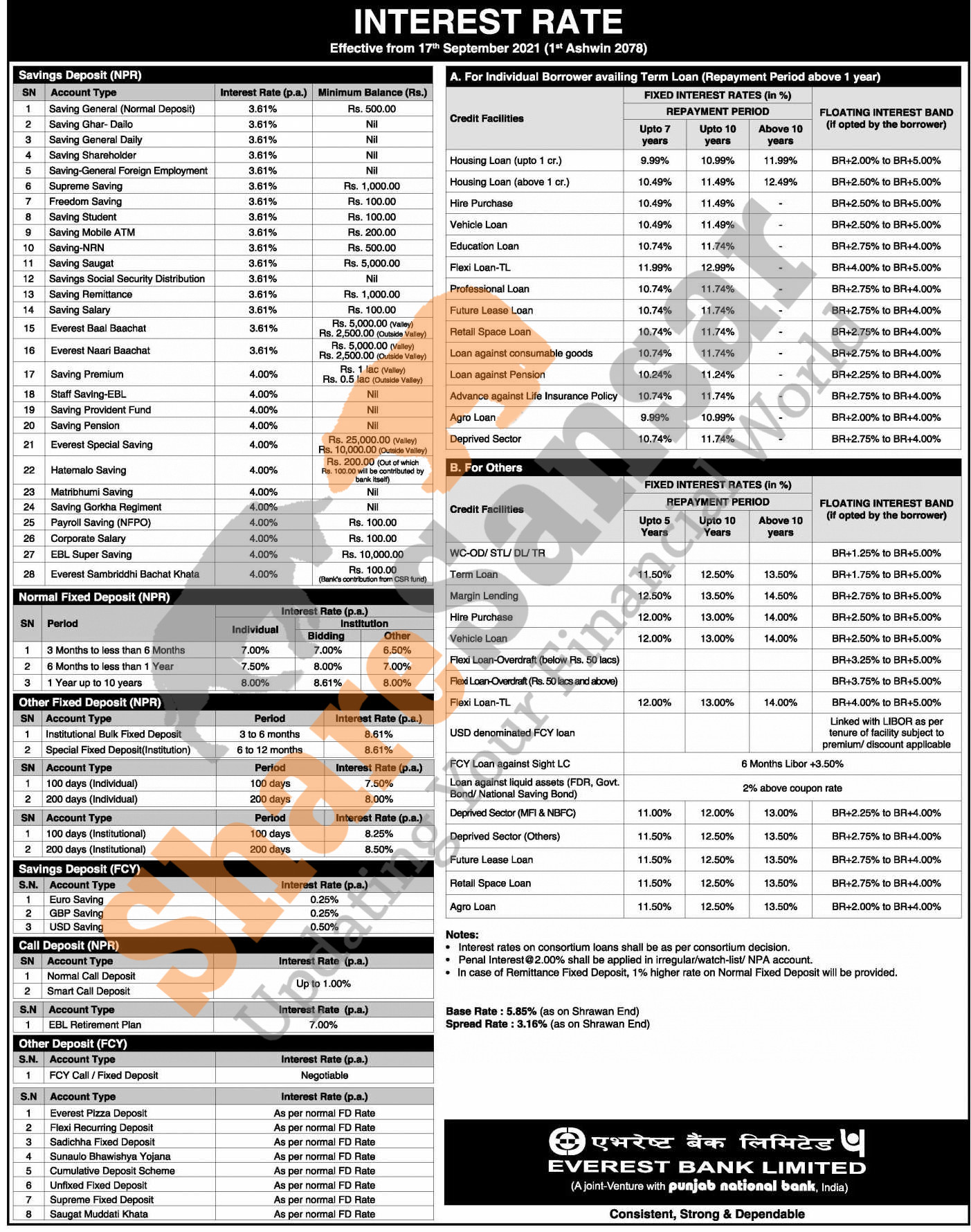 Everest Bank Limited has published a notice regarding the new interest rate for deposit and loan products and it's effective from 1st Ashwin, 2078.