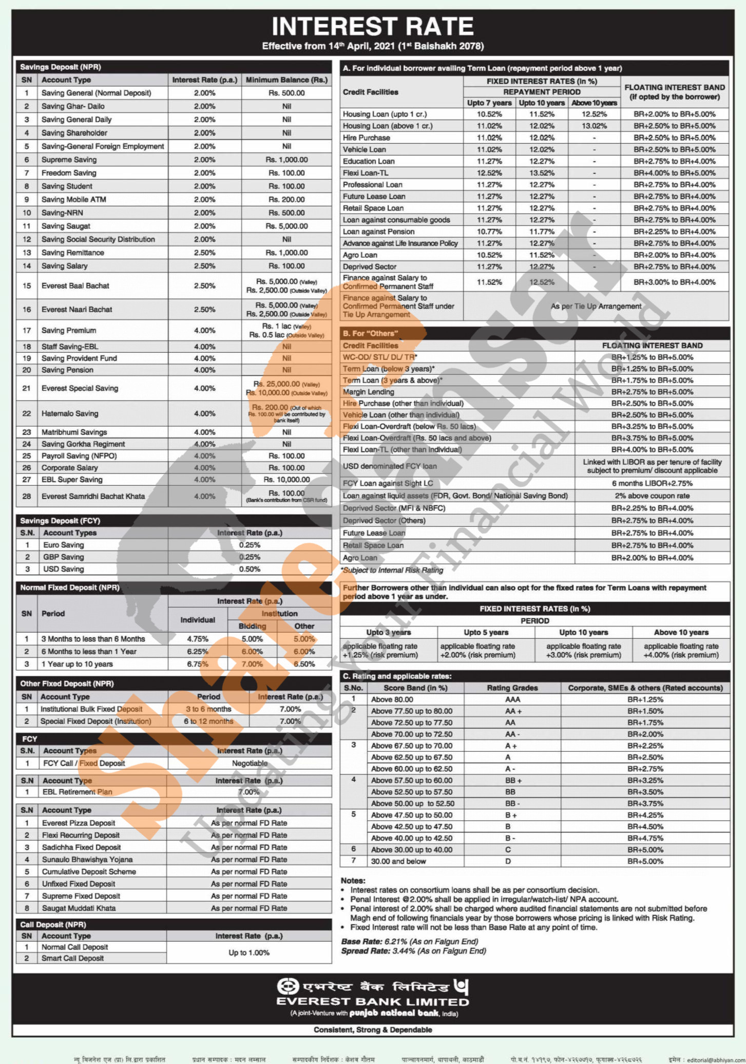 Everest Bank Limited has published a notice regarding the new interest rate for deposit and loan products and it's effective from 1st Baisakh, 2078.