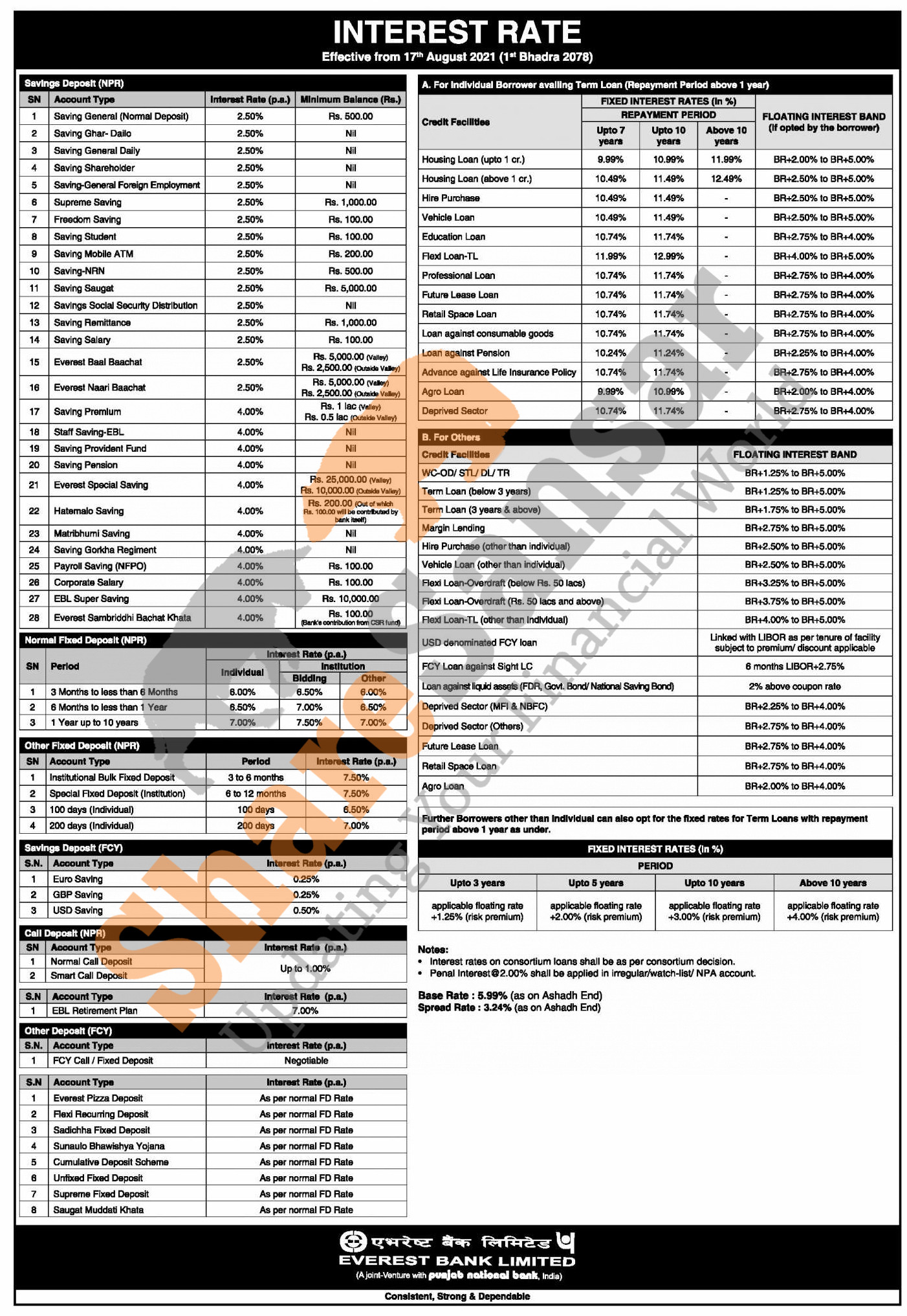 Everest Bank Limited has published a notice regarding the new interest rate for deposit and loan products and it's effective from 1st Bhadra, 2078.