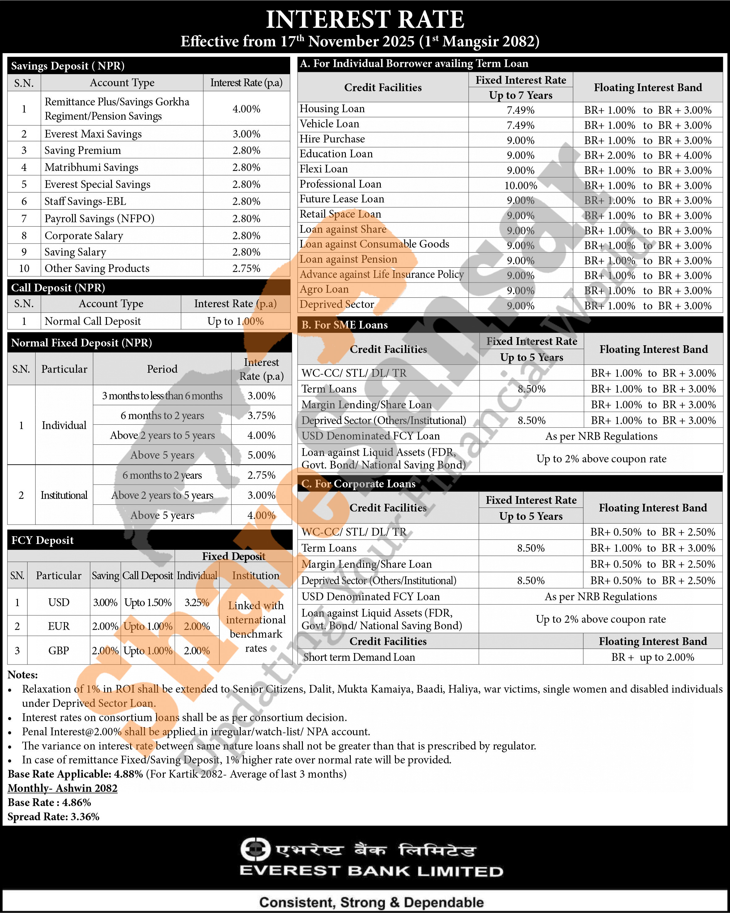 Everest Bank Limited has published a notice regarding the new interest rate for deposit and loan products and it's effective from 1st Mangsir, 2082.
