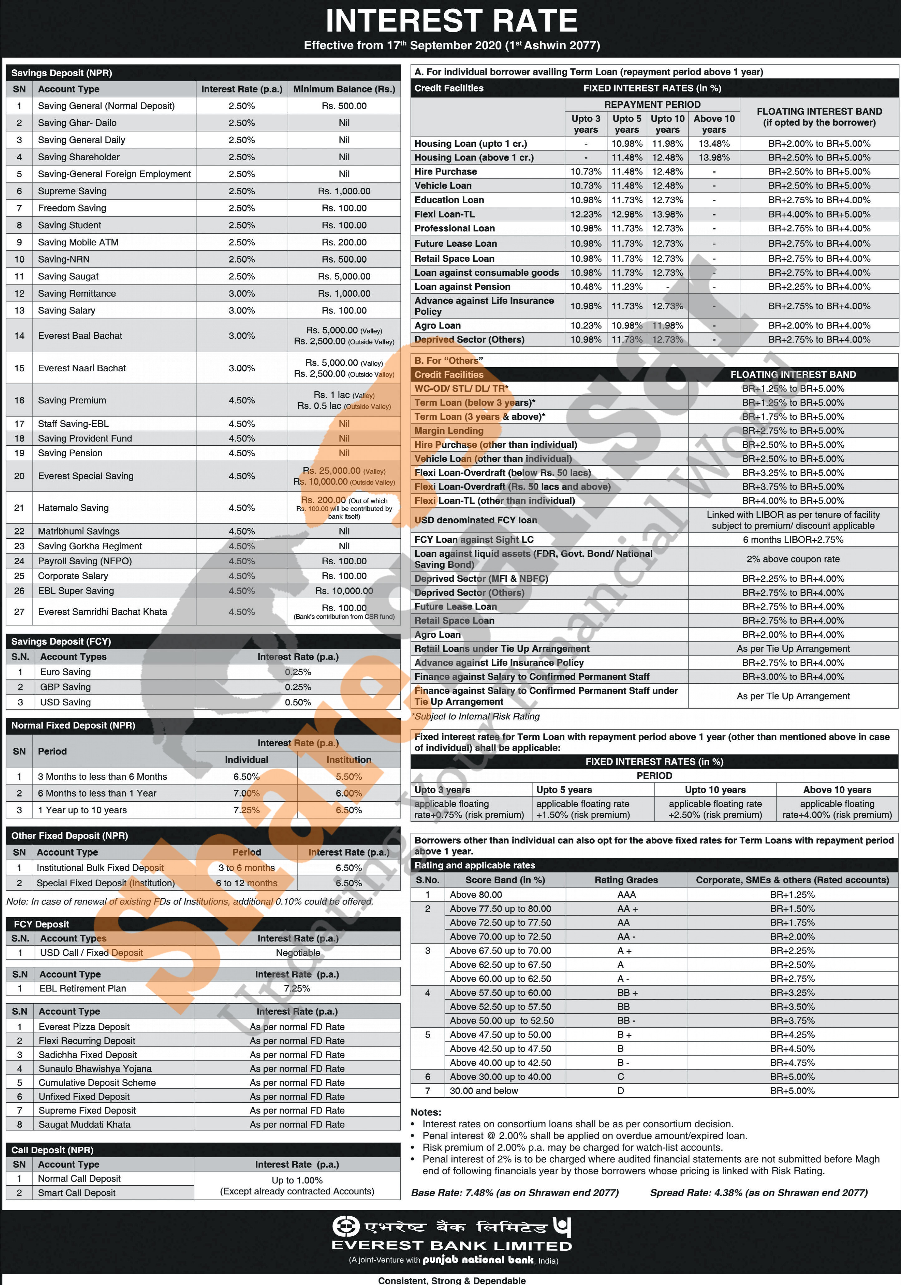 Everest Bank Limited has published a notice regarding the new interest rate for its deposit and loan product and its effective from 1st Ashwin, 2077.