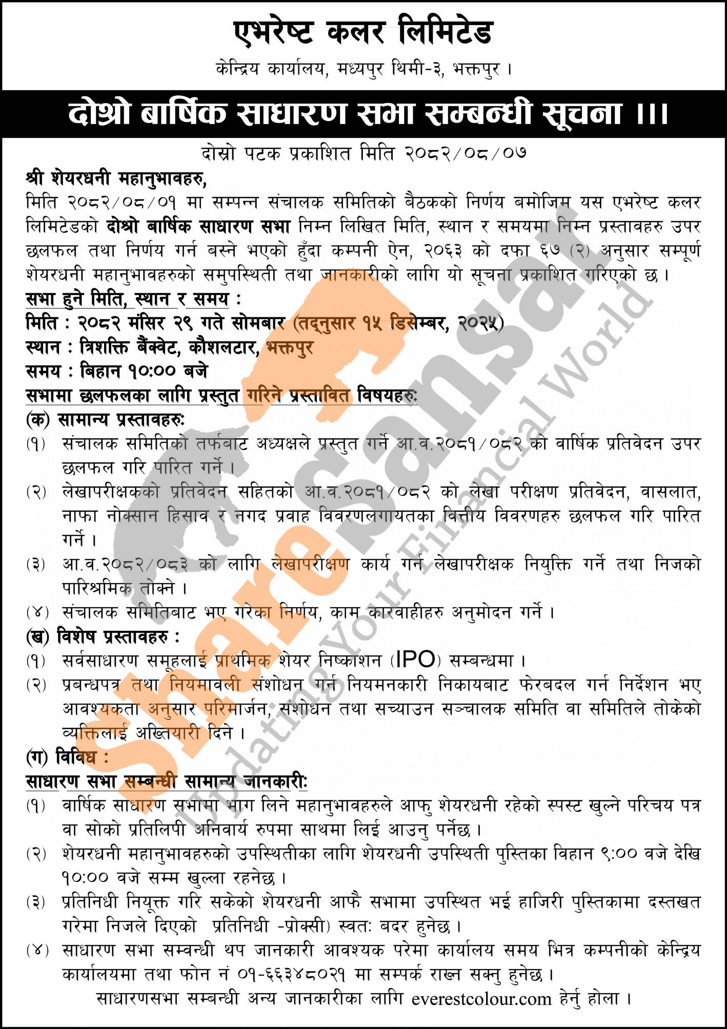 Everest Colour Limited has announced its 2nd AGM going to be held on 29th Mangsir, 2082.