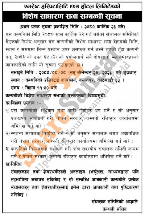 Everest Hospitality and Hotel Limited has announced its SGM going to be held on 8th Mangsir, 2080.