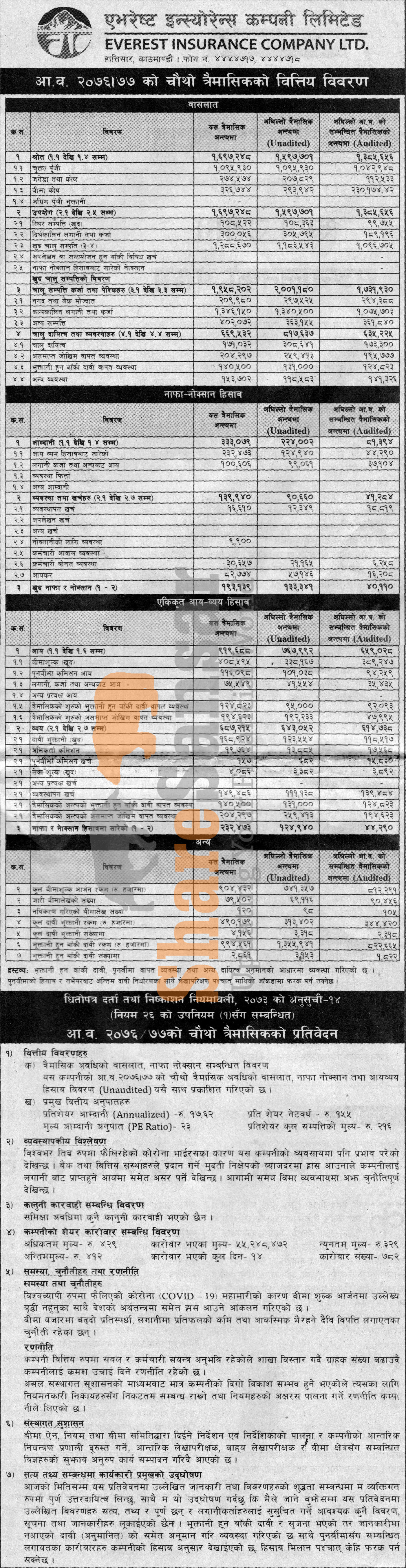 Everest Insurance Company Limited has posted a net profit of Rs 193.13 million and published its 4th quarter company analysis of the fiscal year 2076/77.