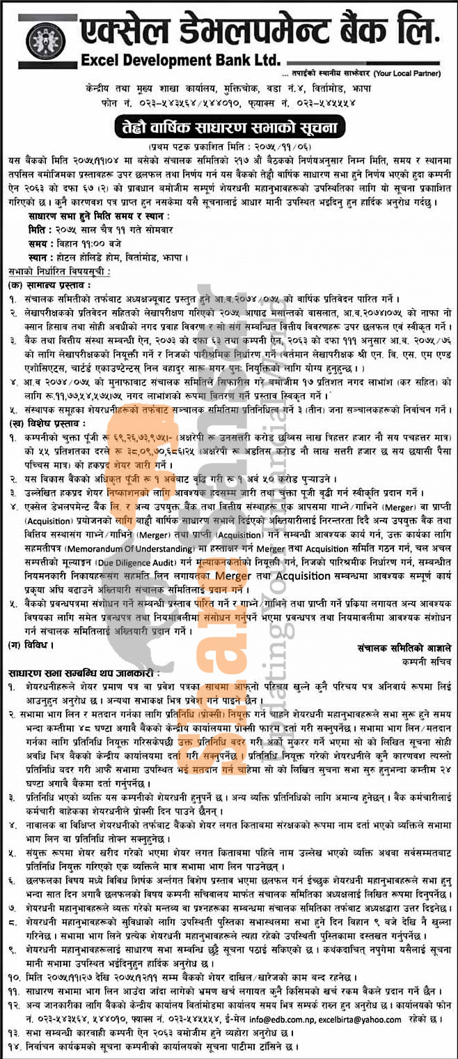 Excel Development Bank Limited has announced its 13th AGM going to be held on 11th Chaitra, 2075.