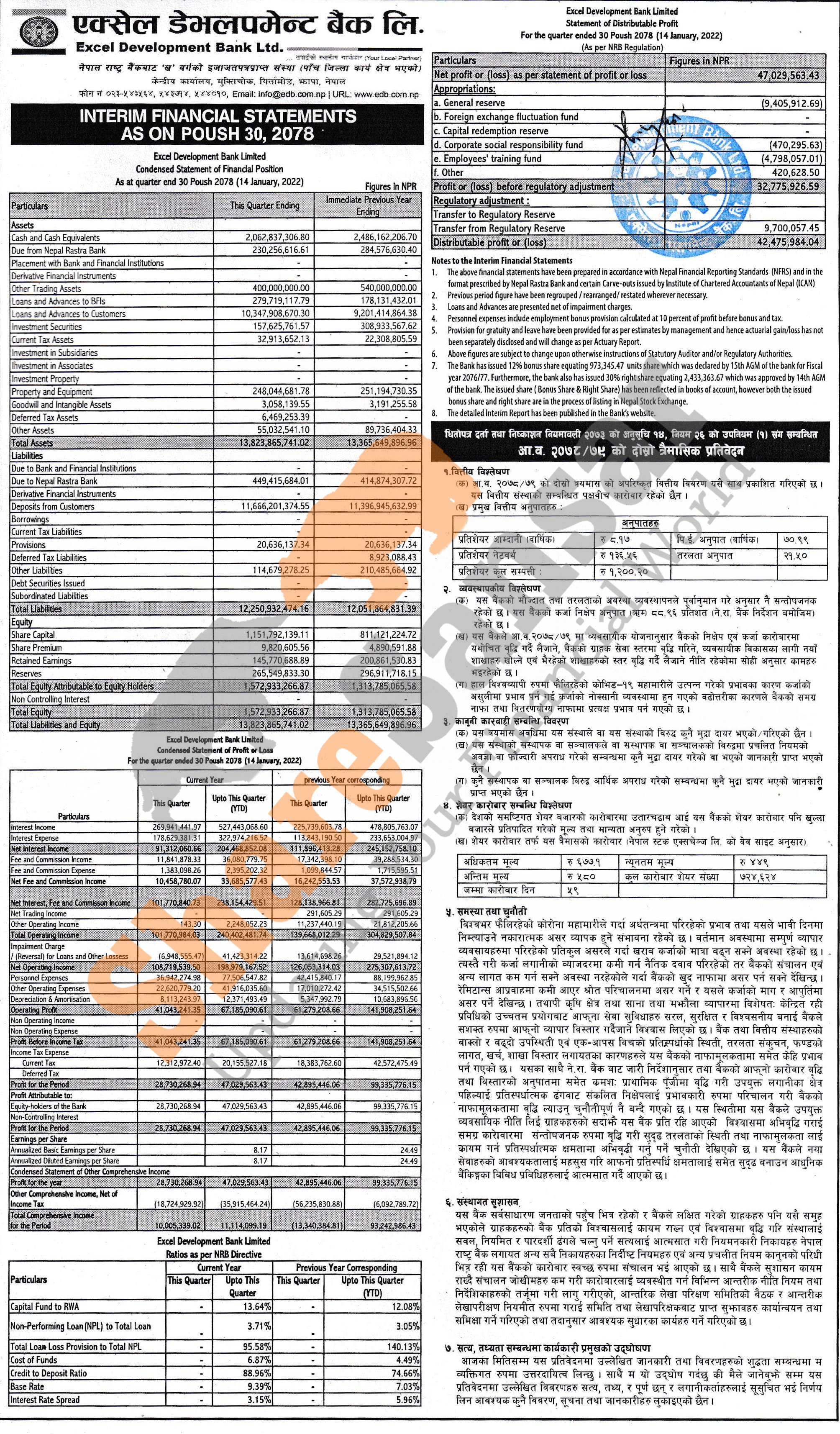 Excel Development Bank Limited has posted a net profit of Rs 47.02 million and published its 2nd quarter company analysis of the fiscal year 2078/79.