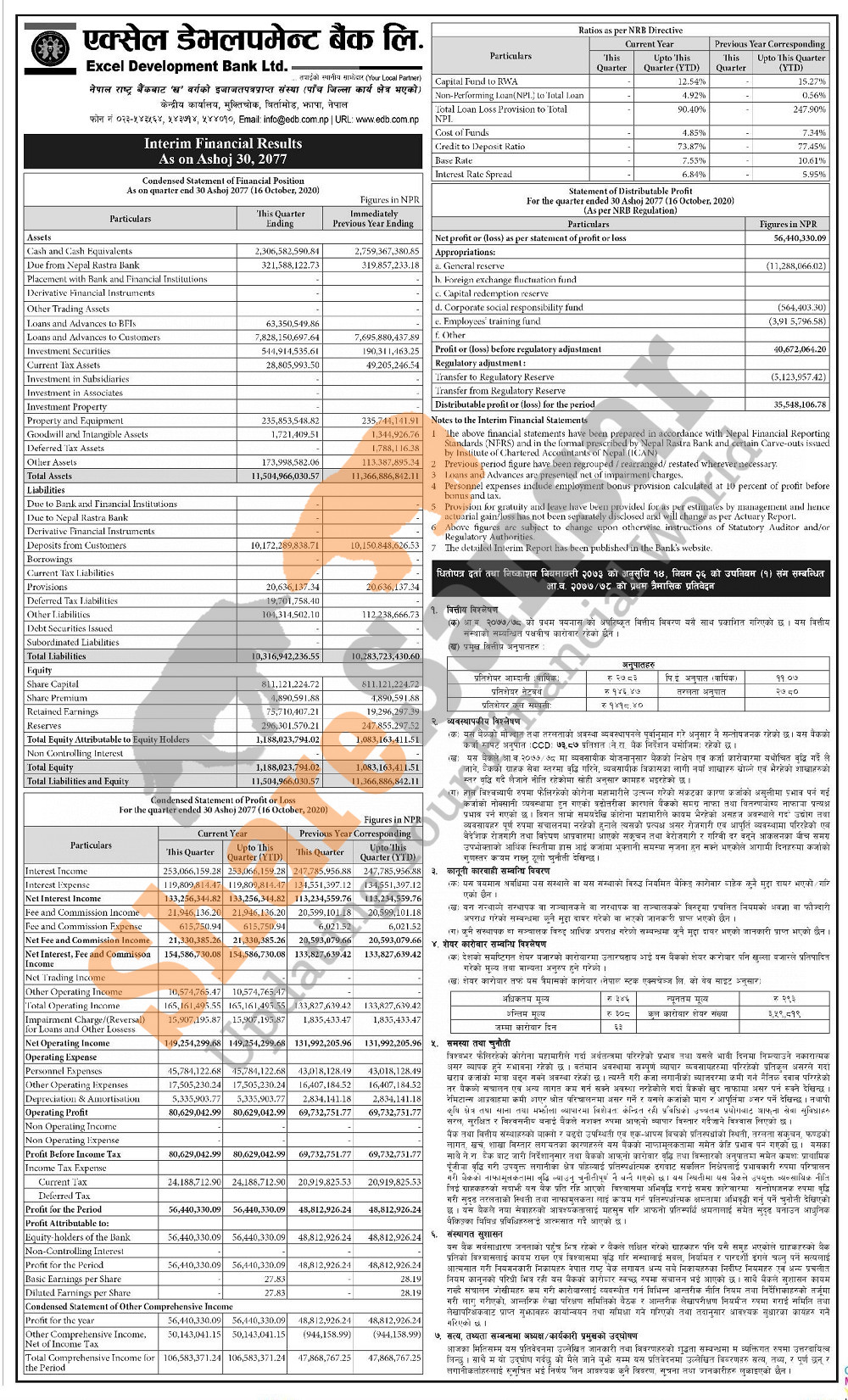 Excel Development Bank Limited has posted a net profit of Rs 56.44 million and published its 1st quarter company analysis of the fiscal year 2077/78.