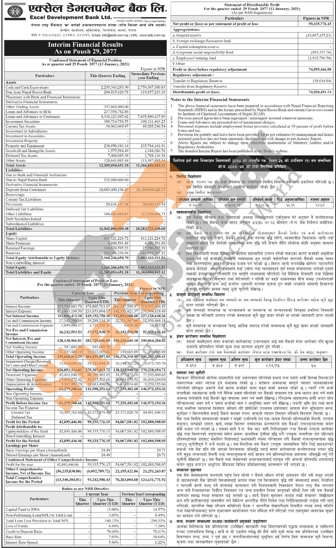 Excel Development Bank Limited has posted a net profit of Rs 99.33 million and published its 2nd quarter company analysis of the fiscal year 2077/78.