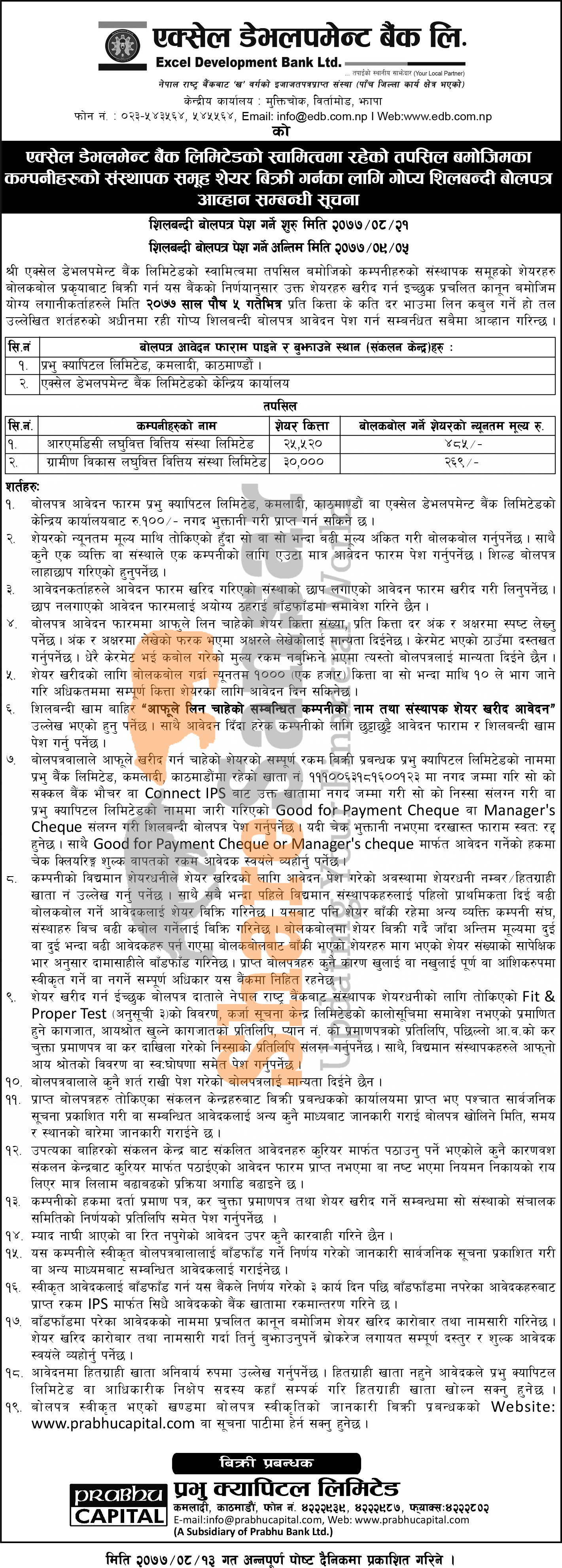 Excel Development Bank Limited has published a notice regarding auction of 2 different companies' shares from 21st Mangsir to 5th Poush, 2077.