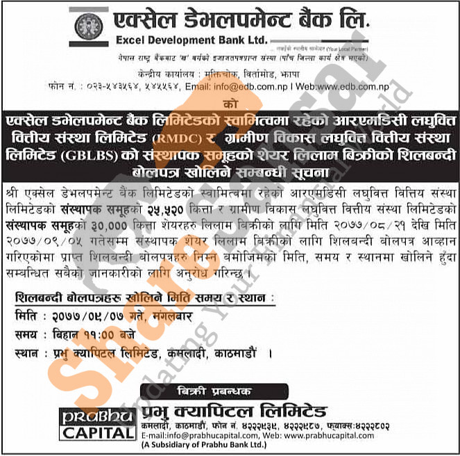 Excel Development Bank Limited has published a notice regarding bid opening date of 25,520 units promoter shares of (RMDC Laghubitta Bittiya Sanstha Limited) and 30,000 units of Promoter shares of (Grameen Bikas Laghubitta Bittiya Sanstha Limited) in auction to the general public on 9th Poush, 2077.