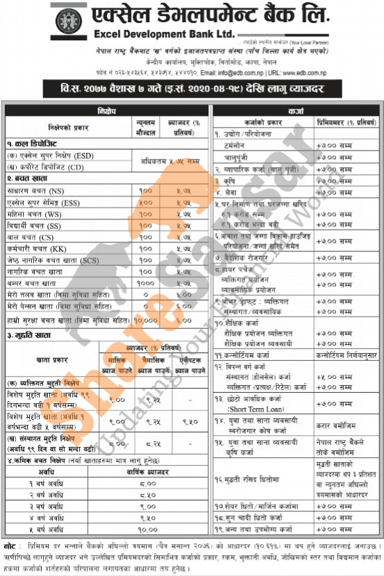 Excel Development Bank Limited has published a notice regarding new interest rate and its effective from 7th Baishakh, 2077.